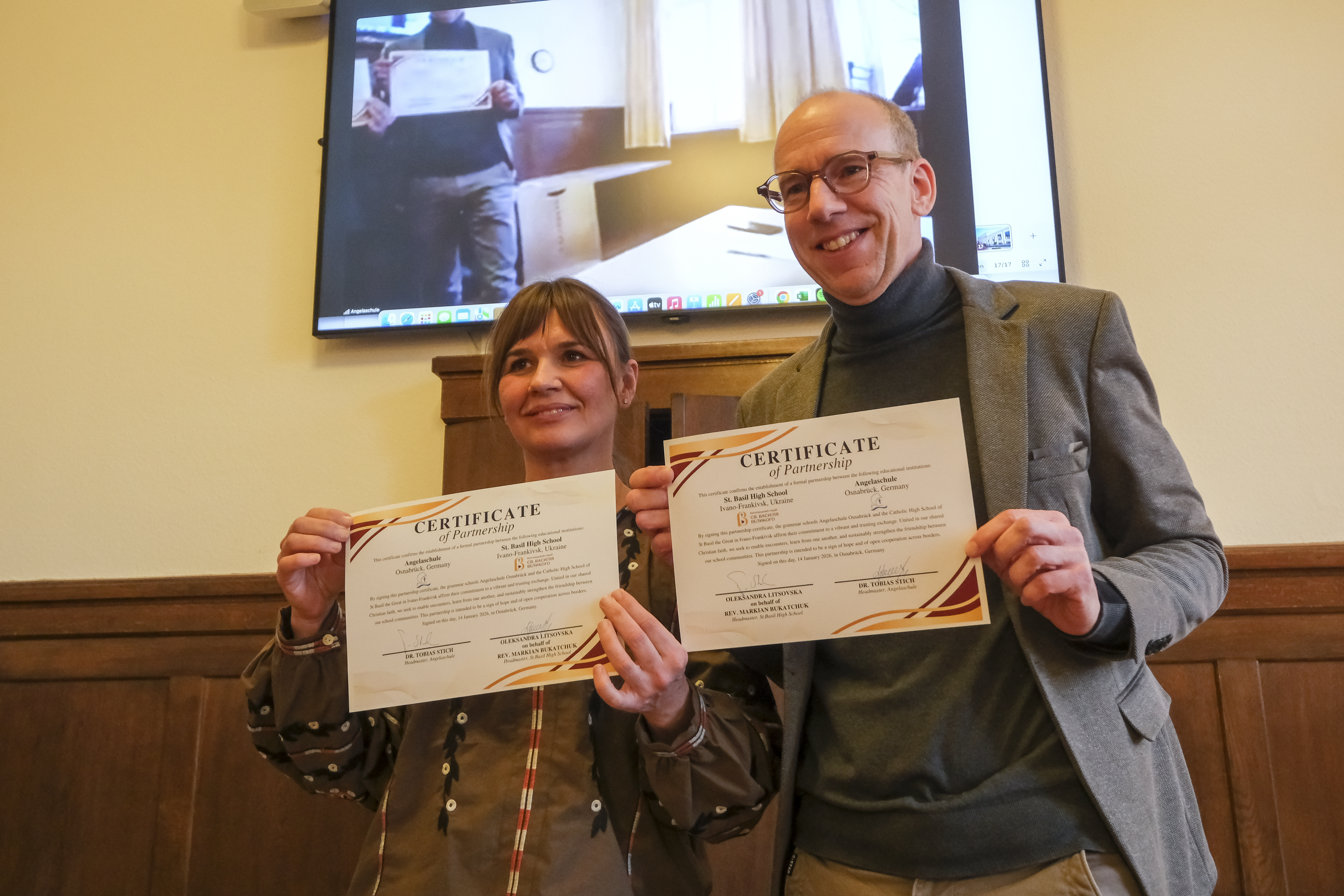 Das Basilius-Gymnasium will den Schülern einen möglichst normalen Alltag, gute Bildung, Begegnungen und internationale Kontakte ermöglichen. „In Momenten, in denen jemand alles Wertvolle und Gute zerstören möchte, bemüht sich unsere Schule, ein Leuchtturm zu sein und den Weg selbst aus der größten Dunkelheit zu weisen“, so Schulleiter Markian Bukatchuk. 2024 schreibt er eine Rundmail an katholische Schulen in Deutschland mit der Bitte um eine Partnerschaft. Auch Tobias Stich, Schulleiter der Angelaschule, erreicht diese Mail in Osnabrück. Er erinnert sich: „Das war zunächst ein peinlicher Moment. Ich merkte, dass ich die Stadt nicht kannte und auch über die ukrainisch griechisch-katholische Kirche eigentlich nichts wusste.“ Dabei sollten gerade die Deutschen mehr in die osteuropäischen Länder schauen, „weil wir im Zweiten Weltkrieg dort so viel Zerstörung verursacht haben“, sagt er – und antwortet auf die Mail. Er betont: „Mit diesem Projekt wollen wir den Horizont unserer Schüler weiten und den Menschen in der Ukraine zeigen, dass sich Menschen in Europa mit ihnen verbunden fühlen.“