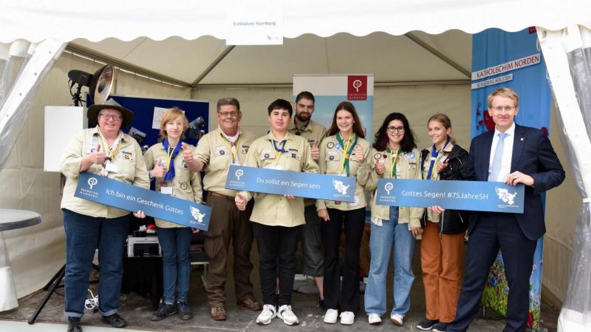 Auch wenn am späten Nachmittag der gesamte Zeitplan des Ministerpräsidenten bereits nur noch Makulatur war, nahm er sich die Zeit, die beiden Pavillons des Erzbistums Hamburg zu besuchen. Claus Everdiking, der die Stände gemeinsam mit Stefanie Murawski betreute, war zufrieden mit der Resonanz der Besucher, vor allem aber mit dem Zusammenspiel mit den Pfadfindern vom Rendsburger DPSG-Stamm „Stern des Nordens“, die auf der Wiese nebenan eine Jurte aufgebaut hatten und zum Stockbrotessen einluden. Eine Einladung, die übrigens auch Generalvikar Ansgar Thim annahm.