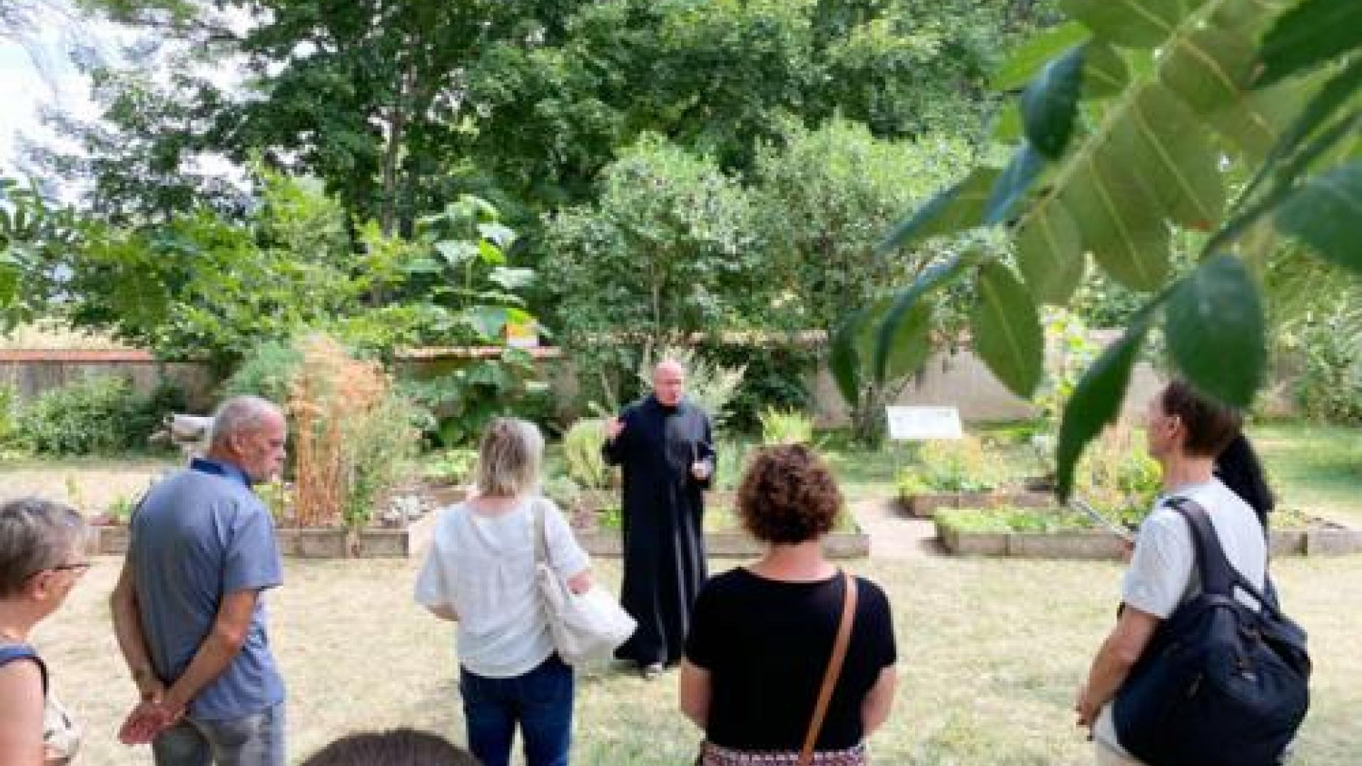 Eine Besuchergruppe im Garten des ehemaligen Klosters Memleben in Sachsen-Anhalt: Die Mönche geben einen Einblick in die Geschichte und in das moderne Klosterleben. Foto: kna/Karin Wollschläger