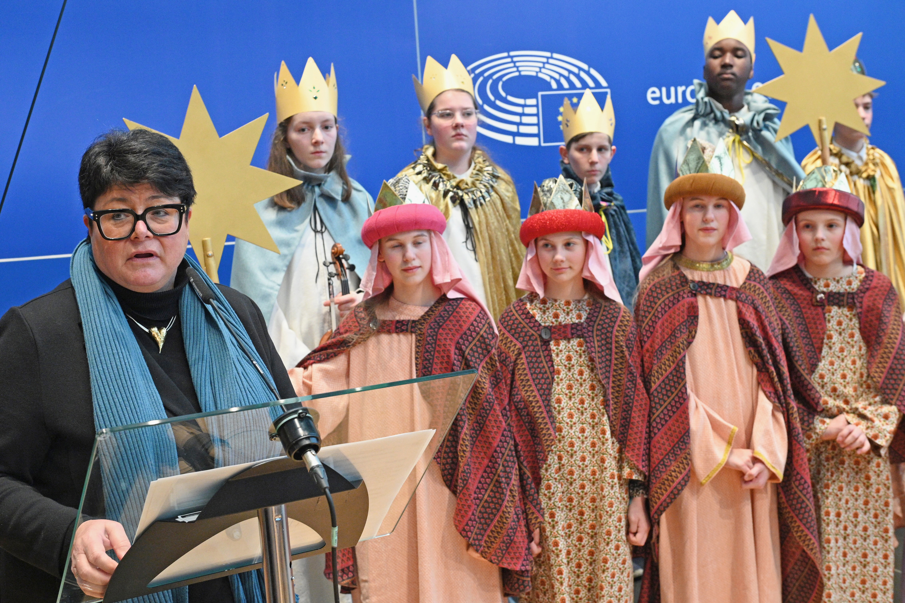 Dann hält sie eine achtminütige Rede. Es seien nur relativ wenige Abgeordnete gekommen, weil die Kommissionspräsidentin gerade im Parlament Rede und Antwort gestanden habe, erläutert sie. Und, an die Sternsinger gewandt: „In eurem Engagement zeigt ihr, wie wichtig es ist, sich füreinander einzusetzen, unabhängig von der Herkunft, von Sprache oder auch von der Religion. Ihr überbringt die Botschaft von Hoffnung, Solidarität und Mitmenschlichkeit und setzt euch besonders für die Interessen von Kindern in aller Welt ein.“ Und weiter: „Mit eurem Einsatz verkörpert ihr die Werte, die uns als Europäische Union verbinden.“ Der Segen, so Verheyen. „erinnert uns daran, dass es hier nicht nur um politische Entscheidungen geht, sondern auch um eine besondere Verantwortung für das Gemeinwohl, für die Zukunft der Menschen in Europa.“
