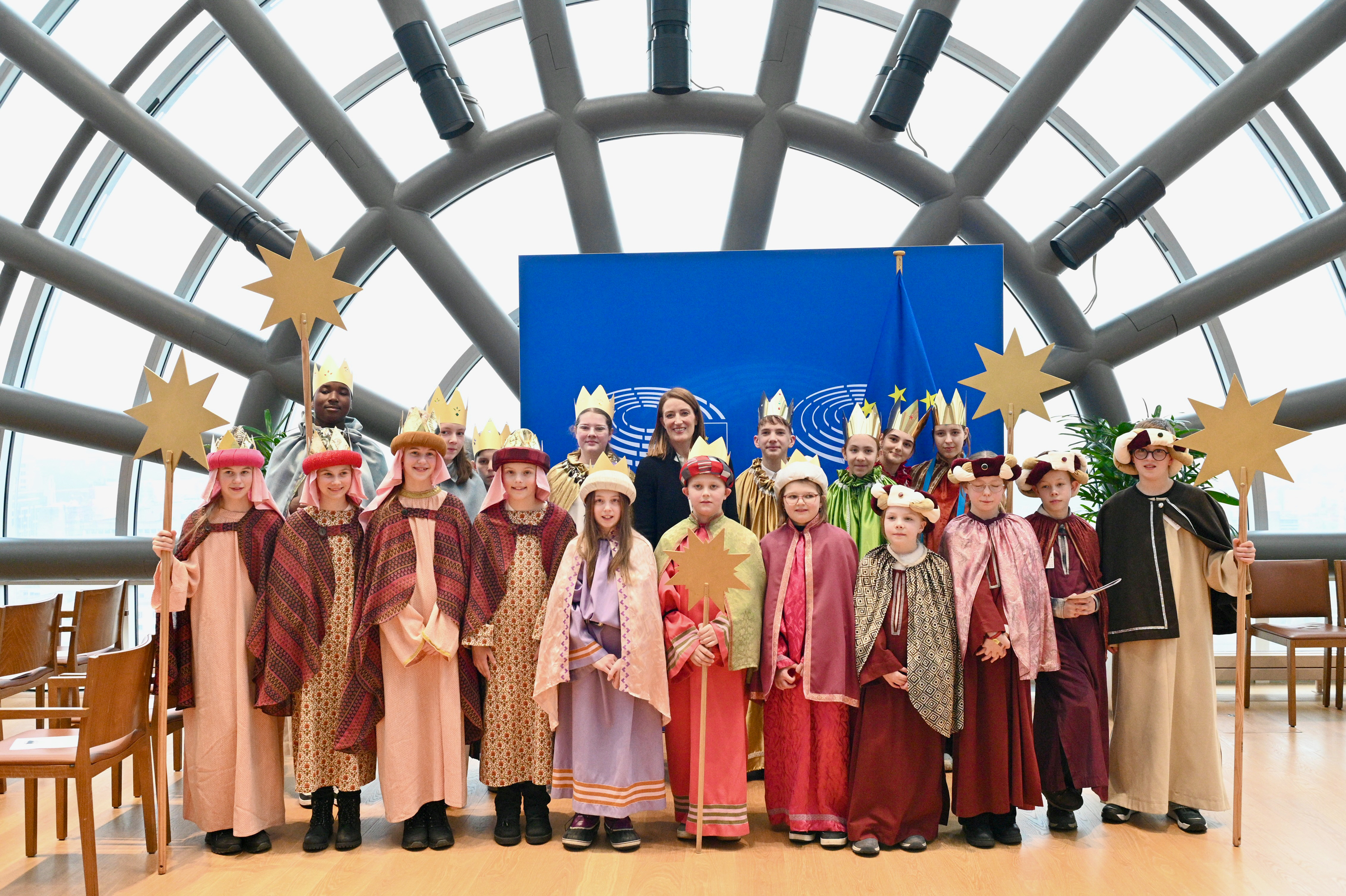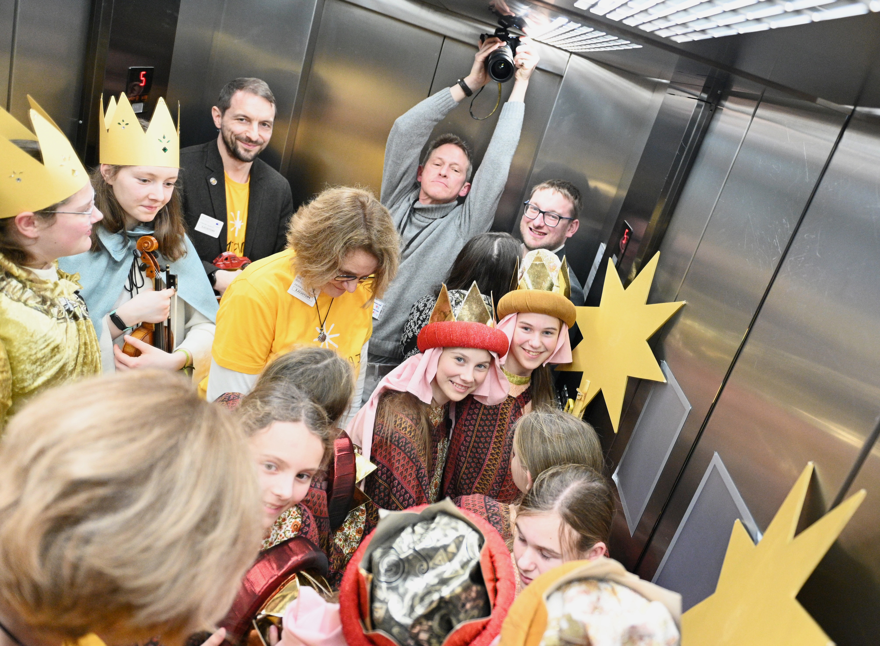 Ob das stimmt, können die Kinder nach einer Pause mit belgischen Waffeln selbst erkunden. Das Parlamentsgebäude ist riesig, breite Flure, alles ist imposant, fast einschüchternd. Die Kinder nehmen es leicht. Sie kommen durch den Protokolleingang rein, wo sie von einem Team des Parlaments begrüßt werden und sich Namenssticker anheften. In einem Raum legen sie ihre Sachen ab, bevor es zur Journalistentribüne geht. Eine Mitarbeiterin informiert über die Arbeit der Abgeordneten. Die Frage, warum die zwölf Sterne der EU-Flagge nur fünf Zacken haben, die der Sternsinger aber acht, kommt überraschend und bleibt offen. Die Mitarbeiterin will das recherchieren – für das nächste Mal.