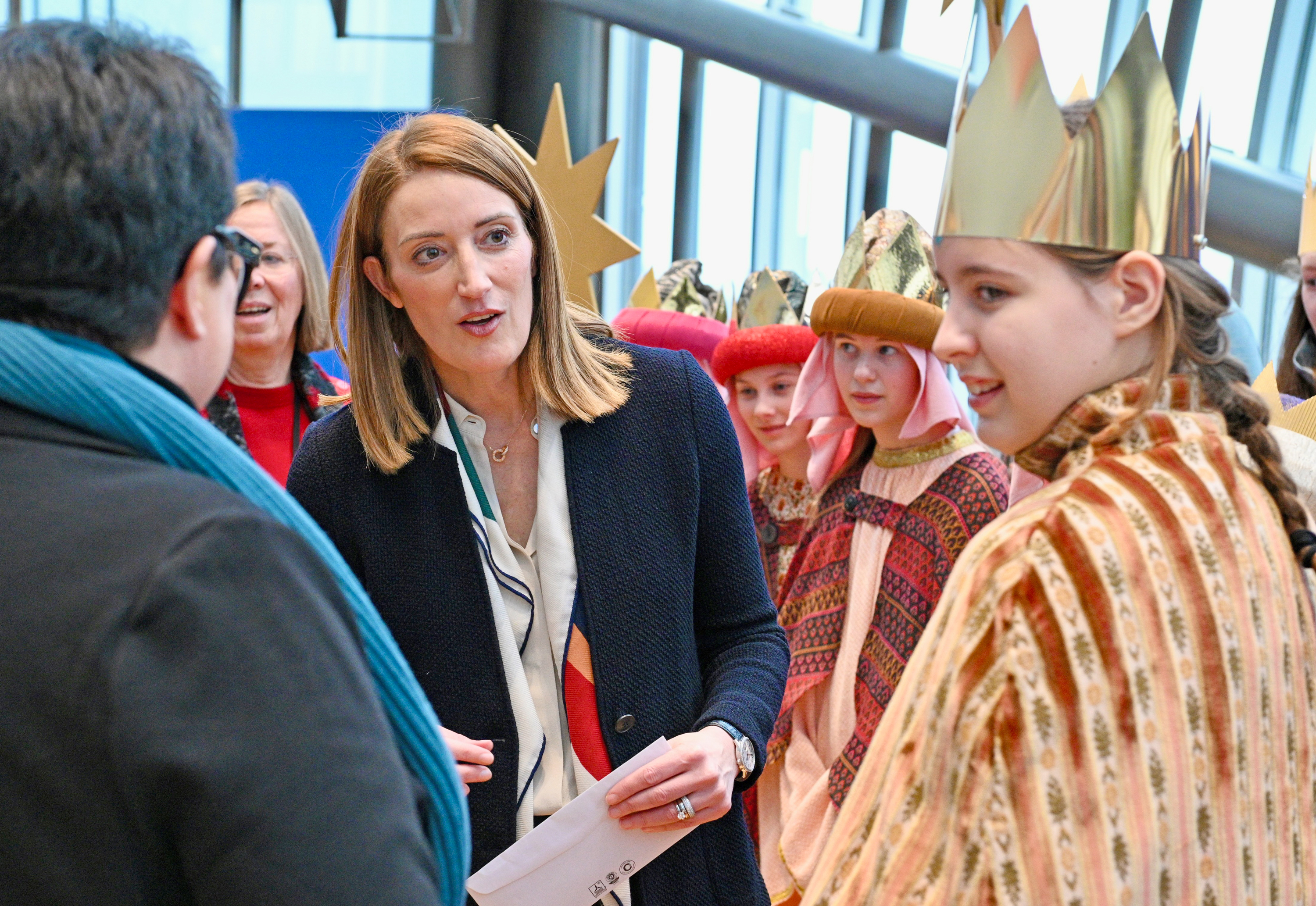 Mittagessen, Umziehen, erneute Probe im Salon Présidentiel im zwölften Stock, dem Raum mit der markanten Kuppe des Parlaments. Die Zeit drängt. Runter zum Protokolleingang, wo Vizepräsidentin Sabine Verheyen die Kinder offiziell begrüßt und das Schild für den Segen hängt. Laura (10) aus Südtirol schreibt ihn drauf. Verheyen ist aus Aachen, das Sternsingen ist ihr wichtig, das merkt man. Im Gespräch berichtet sie, wie sie von Jahr zu Jahr mit Kindern um die Häuser zog, erst mit den eigenen, dann mit anderen. Mit Blick auf das EU-Parlament sagt sie: „Für uns ist das sehr wichtig, weil wir auch Gottes Segen und Gottes Führung für unsere Arbeit brauchen, die wir hier machen.“ Dann singen die Sternsinger, geben alles. Verheyen singt teils mit, ist sichtlich gerührt.