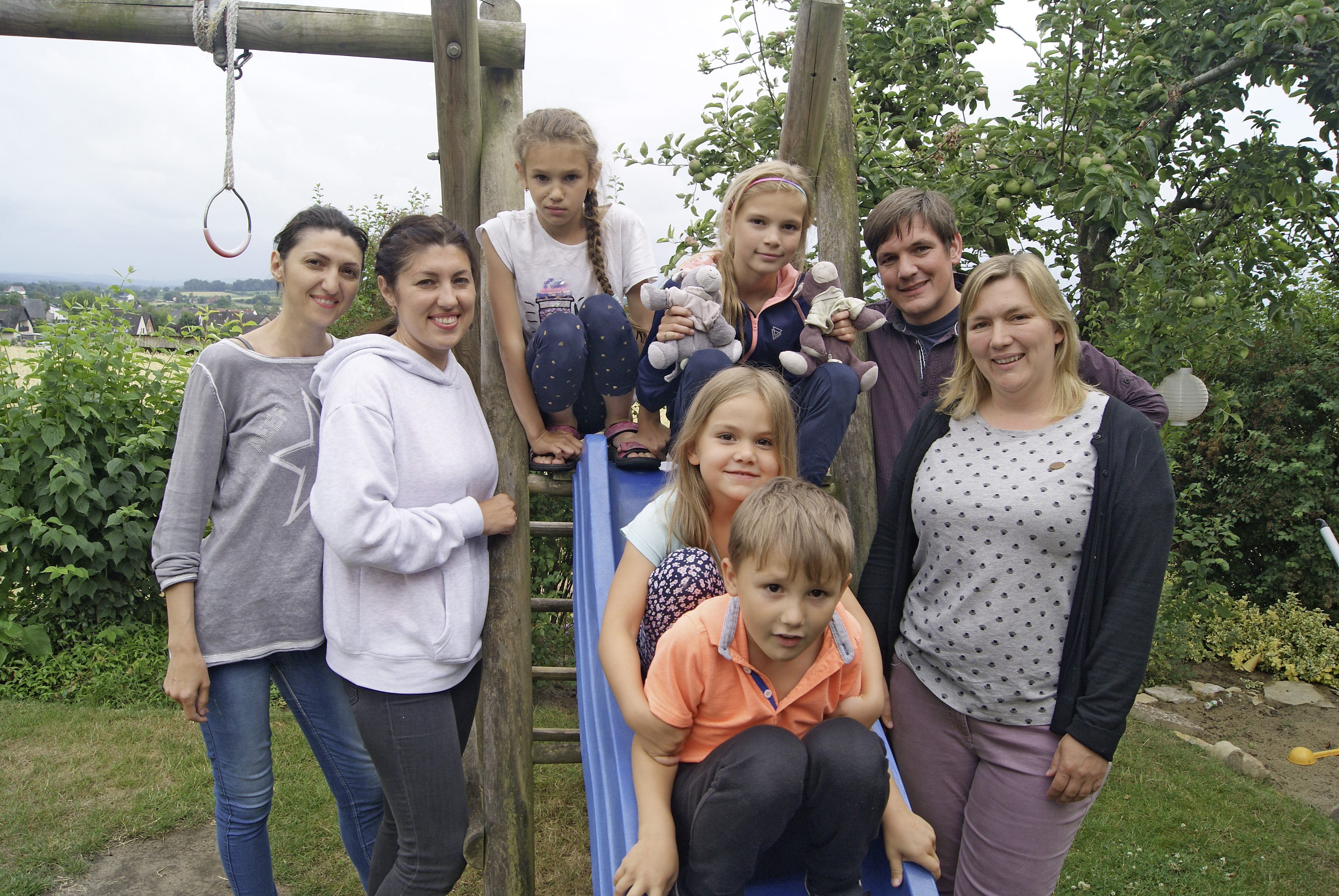 Ein herzlicher Kontakt: (v.l.) Christoph, Ramona und Marie (auf der Schaukel) Hungerkamp mit Olha, Oleh, Mascha und Lena aus der Ukraine.