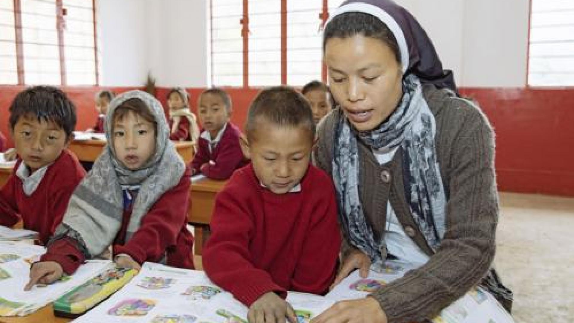 Erst helfen, dann vom Glauben erzählen: Eine Ordensfrau unterrichtet Kinder in dem entlegenen Bergdorf Liyai Khullen im nordostindischen Bundesstaat Manipur. Foto: missio/Hartmut Schwarzbach/argus