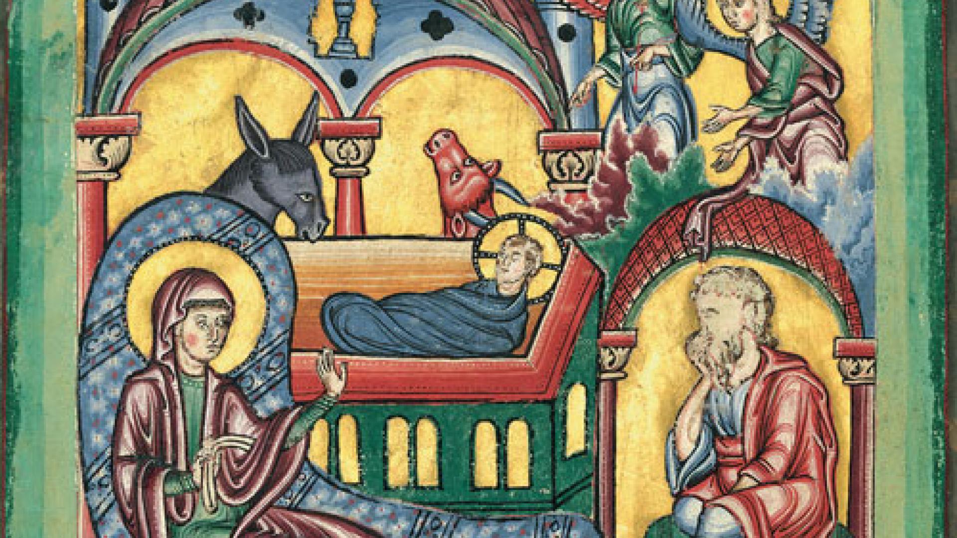 | Die Geburt Christi – Die Verkündigung an die Hirten, Darstellungen aus dem Brandenburger Evangelistar, entstanden Anfang des 13. Jahrhunderts sehr wahrscheinlich in einem Skriptorium in Magdeburg. |