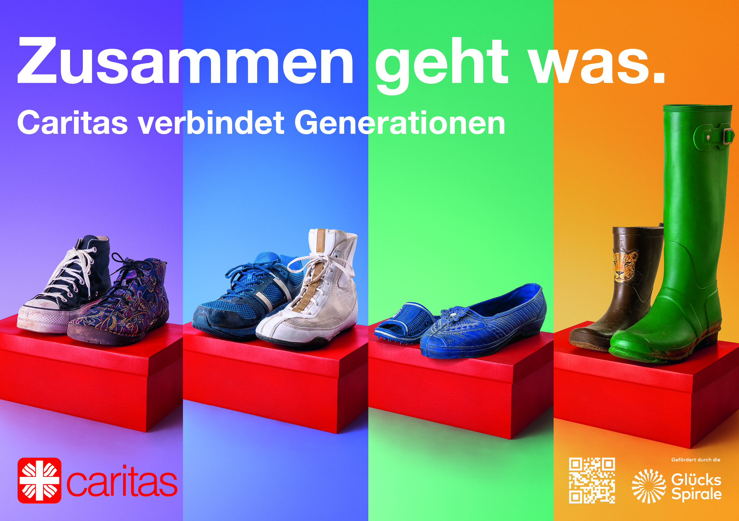 Unter dem Motto „Zusammen geht was. Caritas verbindet Generationen“ werden Mitgliedsverbände und Einrichtungen das ganze Jahr über für ein Füreinander und Miteinander der Generationen werben. Die Kampagne, deren Symbol zwei Schuhe eines Caritas-Generationen-Paares auf rotem Schuhkarton sind, wurde bereits an mehreren Orten eröffnet. Darunter in Schwerin, wo zwei Boxerschuhe auf dem Karton standen.
