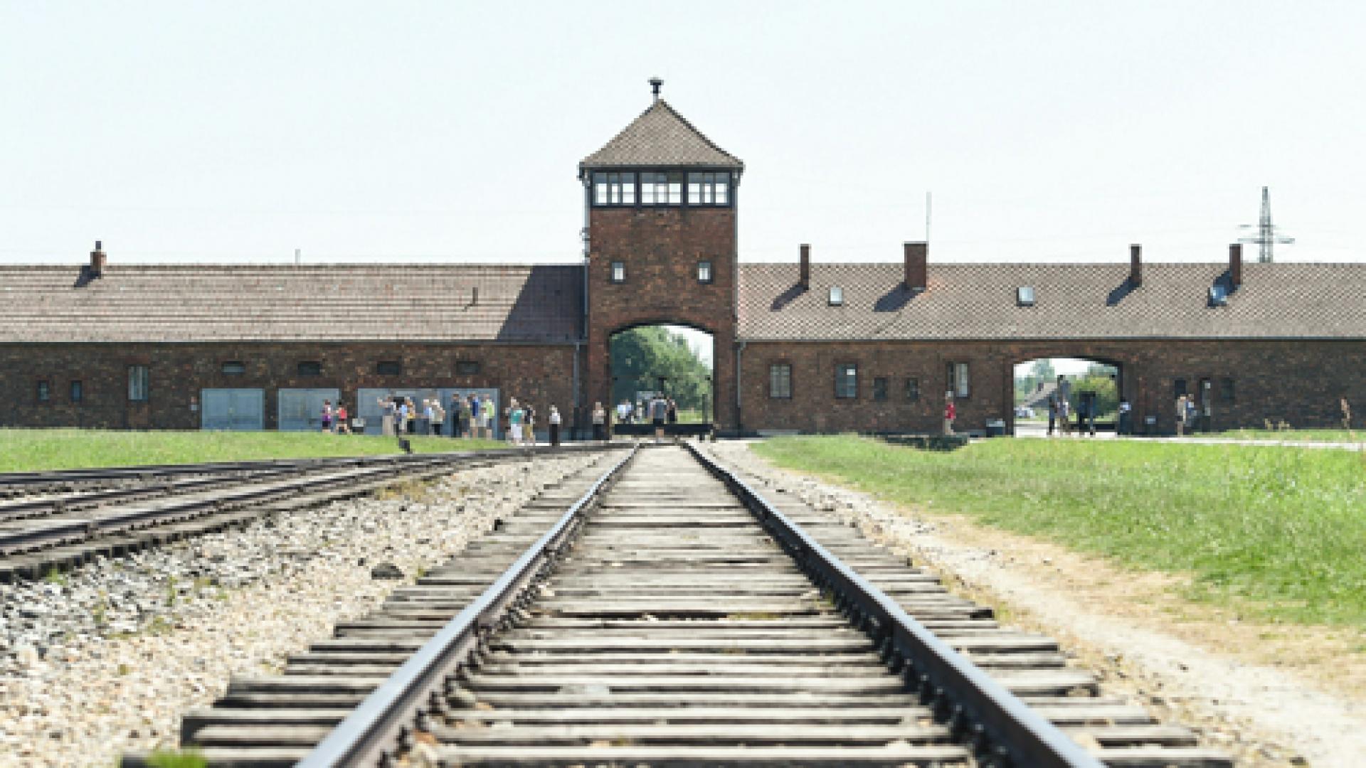 Das Bild zeigt Zugschienen, die auf das Lager Auschwitz zuführen.