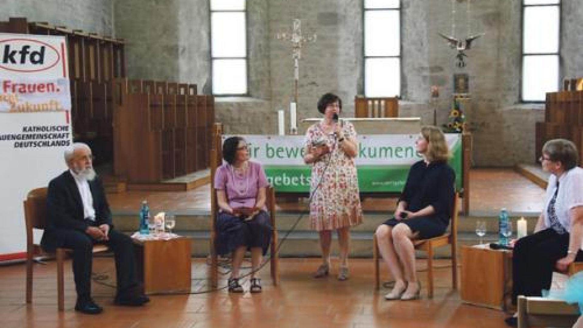 | „Wir bewegen Ökumene“ war ein Podiumsgespräch überschrieben, mit dem die kfd im Rahmen des Frauenfestes ihr 25-jähriges Bestehen beging. Im Bild: Annette Tauth, stellvertretende Sprecherin des kfd-Diözesanverbands, mit den Podiumsmitgliedern Bischof Gerhard Feige, Dorothee Wanzek, Judith Königsdörfer (Lothar-Kreyssig-Zentrum) und Ulrike Göken-Huismann (kfd-Bundesverband). Foto: Susanne Sperling |