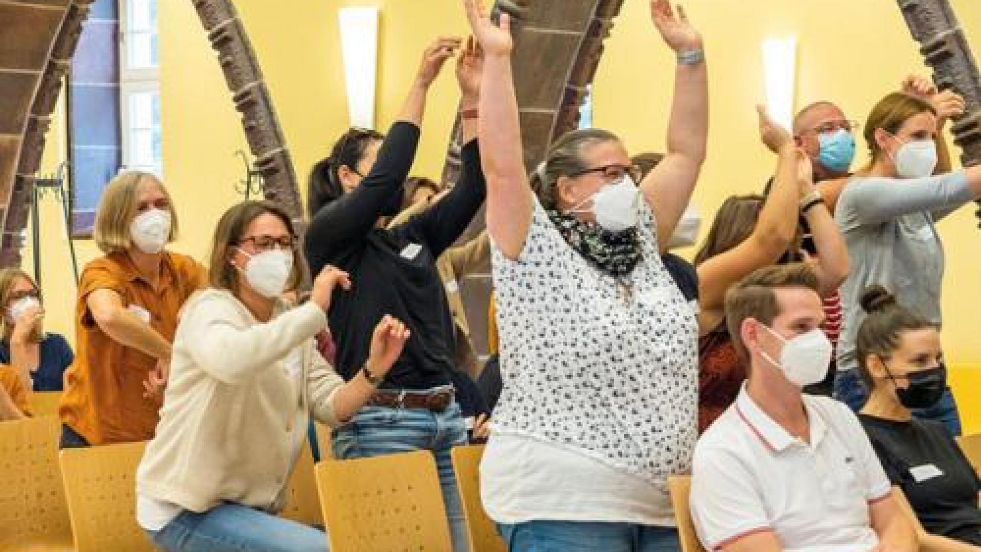 | Hochmotivierte Teilnehmer: Die Schauspielerinnen Dörthe Beerbaum und Barbara Demmer fassten die Tagung zum Abschluss in einem aufheiternden Improvisationstheater zusammen. Sie brachten ihr Publikum dabei unter anderem durch La-Ola-Wellen in Bewegung. Foto: Angela Kroell |