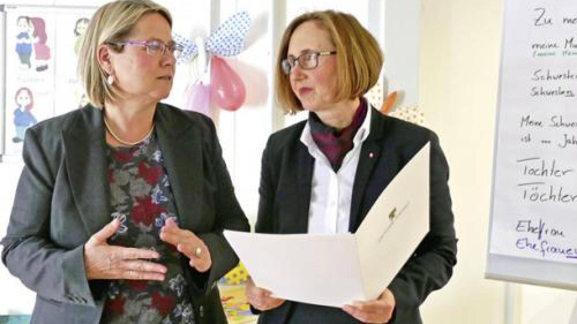 | Staatssekretärin Möbbeck übergibt Caritas-Abteilungsleiterin Schwenke den Förderbescheid. | Foto: Caritas |