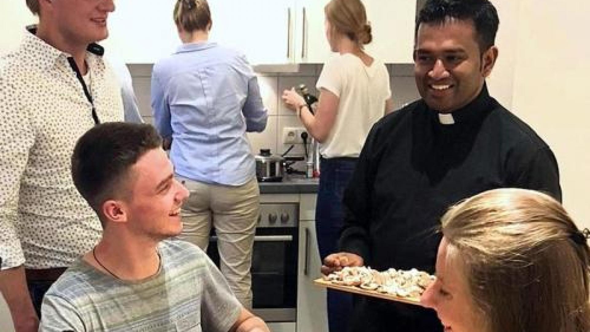 Pfarrer Regamy geht einen anderen Weg: Er will begeistern. Aber wie macht er das bei dem schlechten Image der Kirche? „Es ist ein hoher Anspruch, aber Jesus hat gezeigt, wie das geht: Nicht predigen, sondern das Leben teilen.“ „Komm und sieh!“, hat Jesus bei den Berufungen gesagt, und so macht Pfarrer Regamy es auch. „Ich will junge Leute an meinem Leben teilhaben lassen“, sagt er und meint das ganz praktisch. „Schon in meiner ersten Kaplansstelle habe ich meine Wohnung für Jugendliche geöffnet; die sind bei mir ein- und ausgegangen. Als ich beim Auszug den Teppich entsorgt habe, hat man das auch gesehen.“ Offenbar hat seine Art zu leben und zu glauben angesteckt. „Es waren ein paar dabei, die Theologie studiert haben.“
