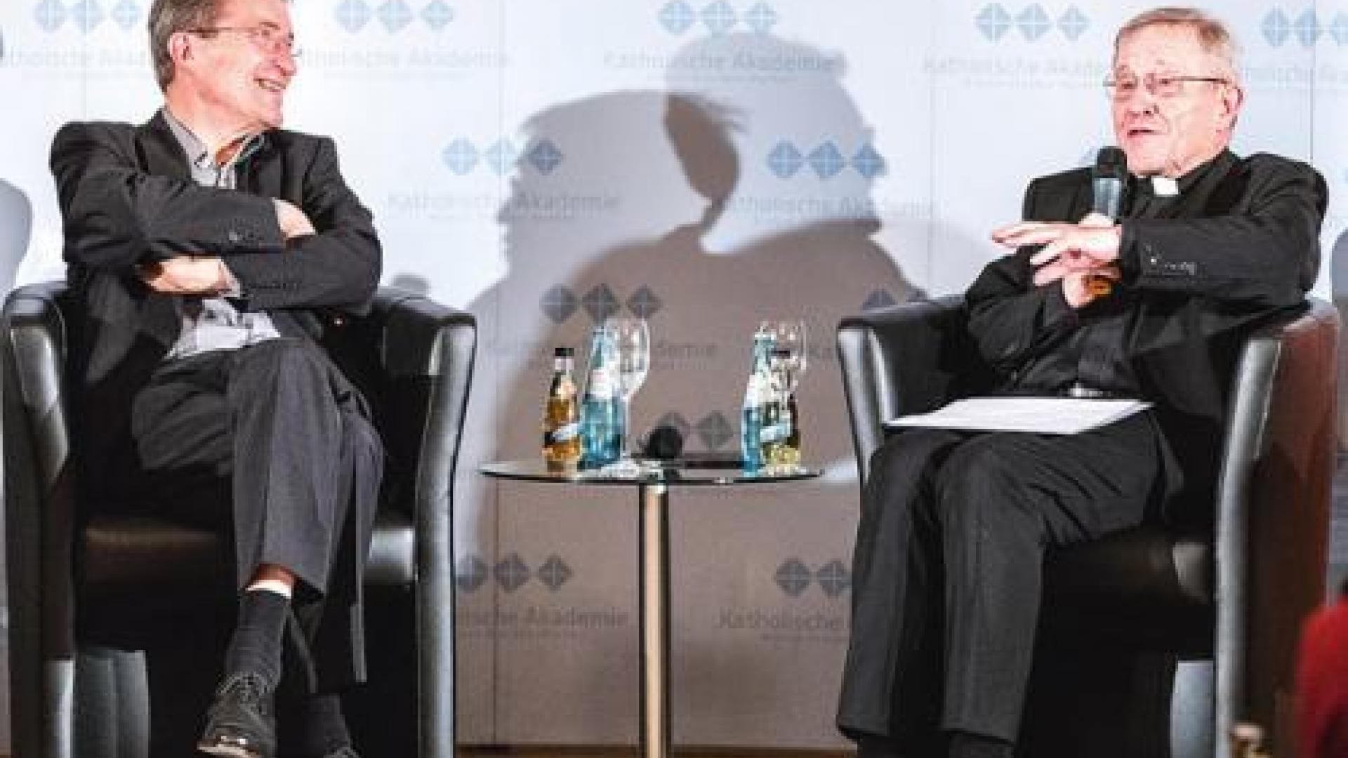 | In der Alten Börse in Leipzig diskutierten Bischof Huber (links) und Kardinal Kasper auf Initiative der Katholischen und der Evangelischen Akademie über die Zukunft der Ökumene, besonders über das Amt in der Kirche. Foto: Philipp Kirsschner |