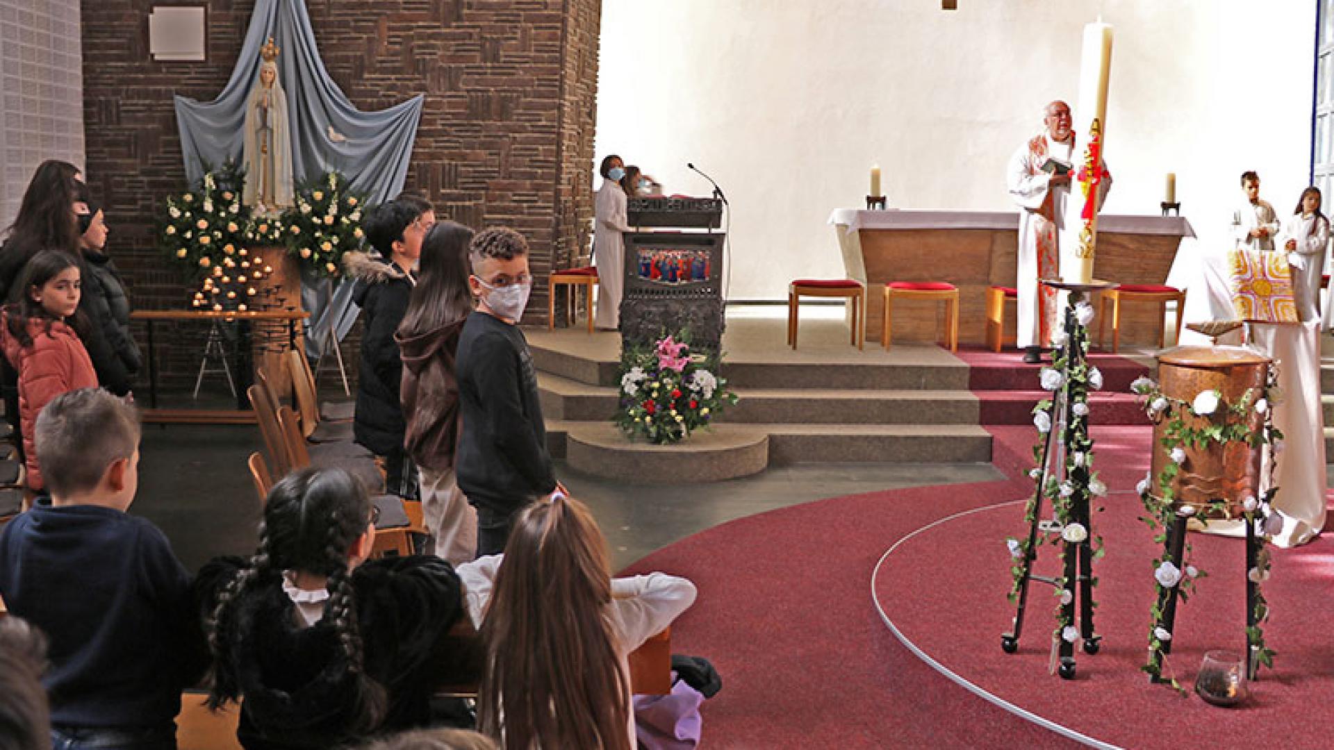 Maria Santos lacht viel und regelt im Laufschritt all die hundert kleinen Dinge, die organisiert werden müssen, bevor um 16.15 Uhr wie an jedem Samstagnachmittag der Vorabendgottesdienst in deutsch-portugiesischer Sprache startet. Sie ist Gemeindeleiterin, Küsterin und Ansprechpartnerin für alle Dinge rund um die Gemeinde gleichzeitig. Die Utensilien, die für die Fatima-Prozession am nächsten Samstag gebraucht werden, sind nicht da, wo sie im vergangenen Jahr abgestellt wurden. Maria Santos kümmert sich, spricht Pfarrer Christian Piegenschke an, der an diesem Tag den Gottesdienst abhalten wird und bittet ihn, der Sache auf den Grund zu gehen. Dann sind die Kerzen anzuzünden und nebenbei die Besucherin von der KirchenZeitung zu betreuen. Die Kommunionkinder üben inzwischen die Gabenbereitung zusammen mit Organistin und Chorleiterin Natalie Peres und Katechetin Fatima Martins. Beim Proben des Gesangs sind die Kinder dann ganz bei der Sache. Voll Begeisterung und Inbrunst singen sie gemeinsam die einstudierten Lieder, die sie auch während ihrer Erstkommunion singen werden. „Sind sie nicht toll?“, sagt Maria Santos stolz.