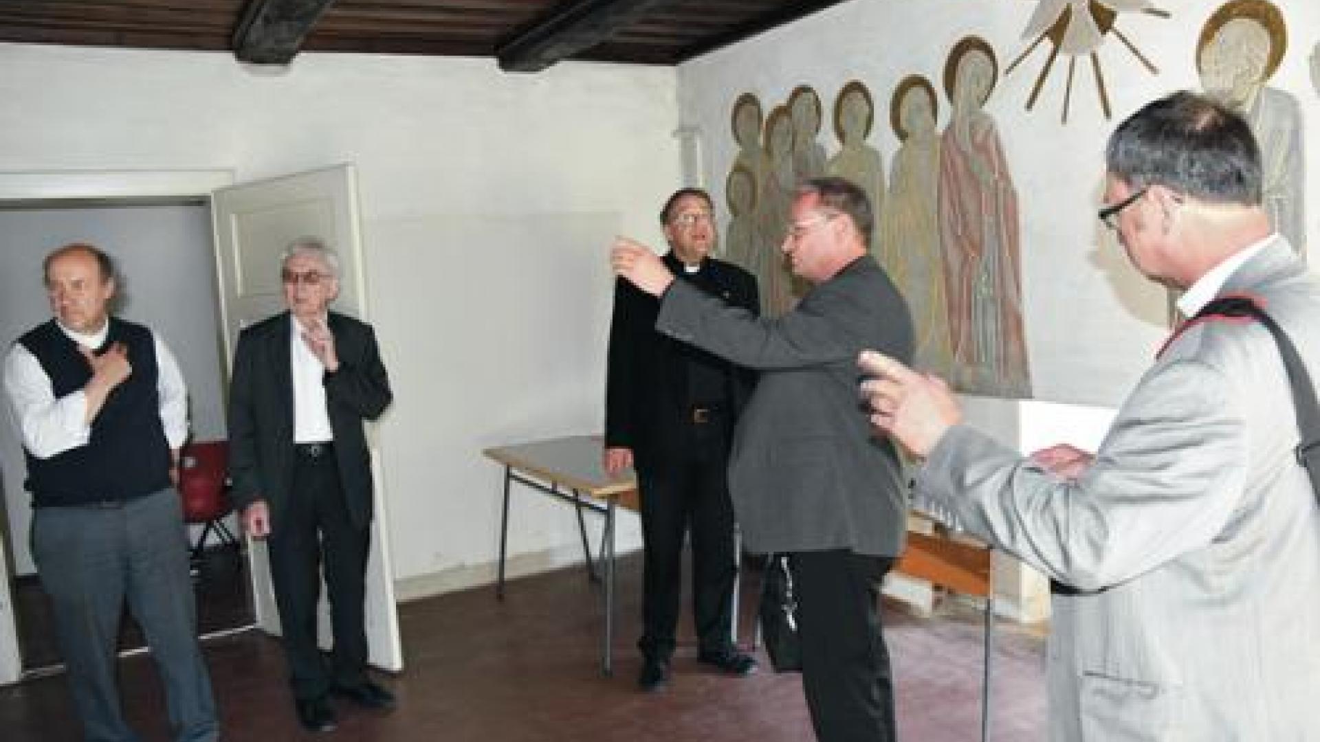 | Ehemalige Seminaristen mit Subregens Kresák in der früheren Kapelle des Priesterseminars. |