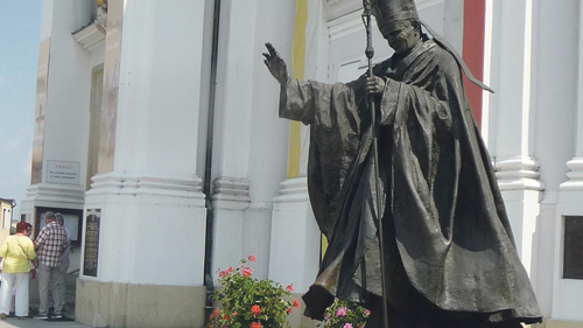 | Als Ministrant assistierte Karol Wojtyla in der Basilika von Wadowice in vielen Gottesdiensten. Heute erinnert eine Statue vor der Kirche an den späteren Papst Johannes Paul II.. Fotos: Benedikt Vallendar |