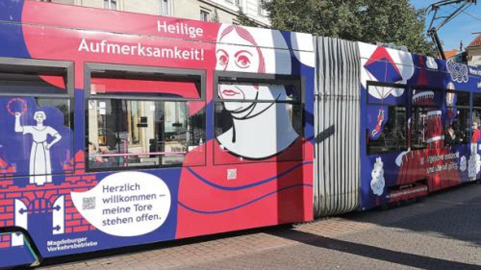 | Mechthild von Magdeburg ist eine von insgesamt 14 Personen, Symbolen und Orten der Elbestadt, die auf einer neu gestalteten Straßenbahn für Vielfalt, Weltoffenheit und Demokratie werben. Foto: pbm |