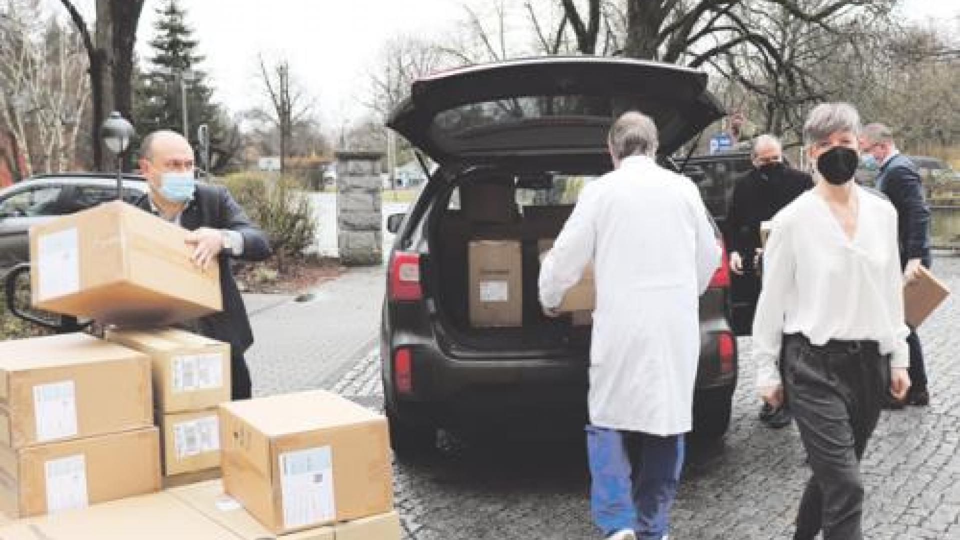 Gemeinsam verstauten die Oberbürgermeister, der Ärztliche Direktor, die Standortleitung und der Geschäftsführer, die Hilfslieferung in die Autos.