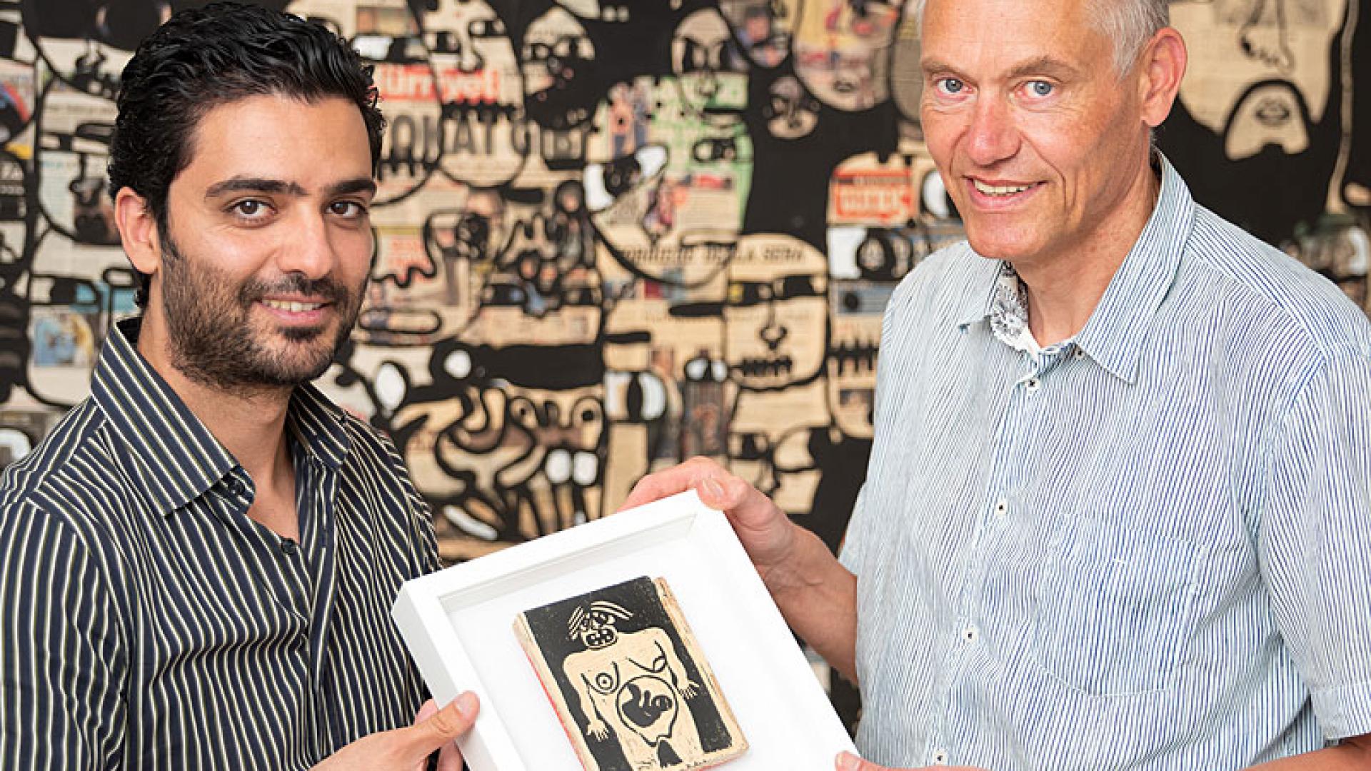 Der syrische Künstler Alaa Nasser (l.) zeigt Museumsdirektor