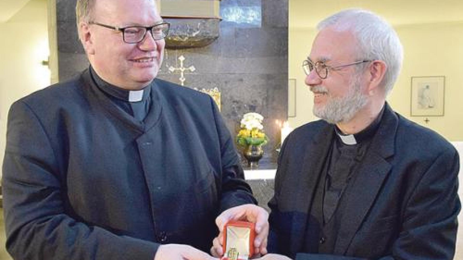 Wolfgang und Karin Gruhn hatten bereits im Vorfeld der Vesper ihrer Dankbarkeit gegenüber Monsignore Bosbach Ausdruck verliehen, als sie ihm den Original Berliner Bären, gefertigt in der Königlichen Porzellan-Manufaktur Berlin (KPM), überreichten. (pib/tdh)