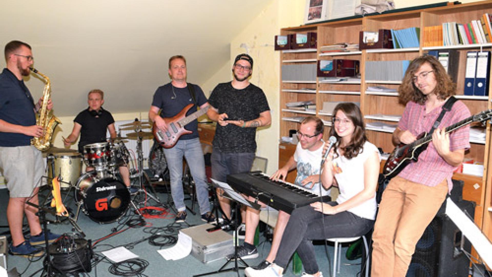 | Zu den Bands, die die Songs-CD 2019 aufgenommen haben, gehören „Die Schnongse“ aus Eisleben und die Projekt-Band „Käpt’n Übermorgen“. Musiker der Gruppen spielen hier extra für den Fotografen gemeinsam. Denn für die Einspielung wird jede Stimme und jedes Instrument einzeln aufgezeichnet. Fotos: Eckhard Pohl |