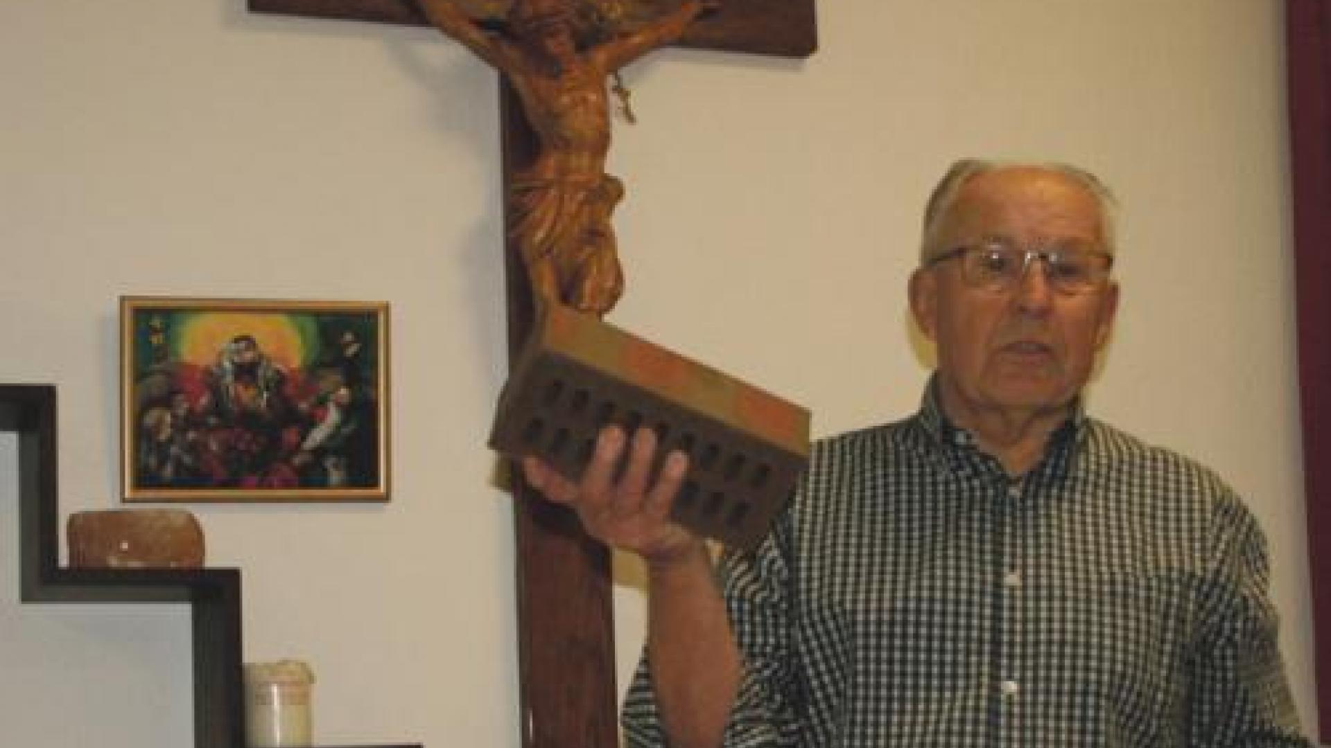| Robert Wand zeigt einen Baustein von denen, die beim Bau des Ensembles Pfarrhaus-Gemeindehaus-Kirche verwendet wurden. Anders als im DDR-Wohnungsbau ging es hier nicht um Plattenmontage. |