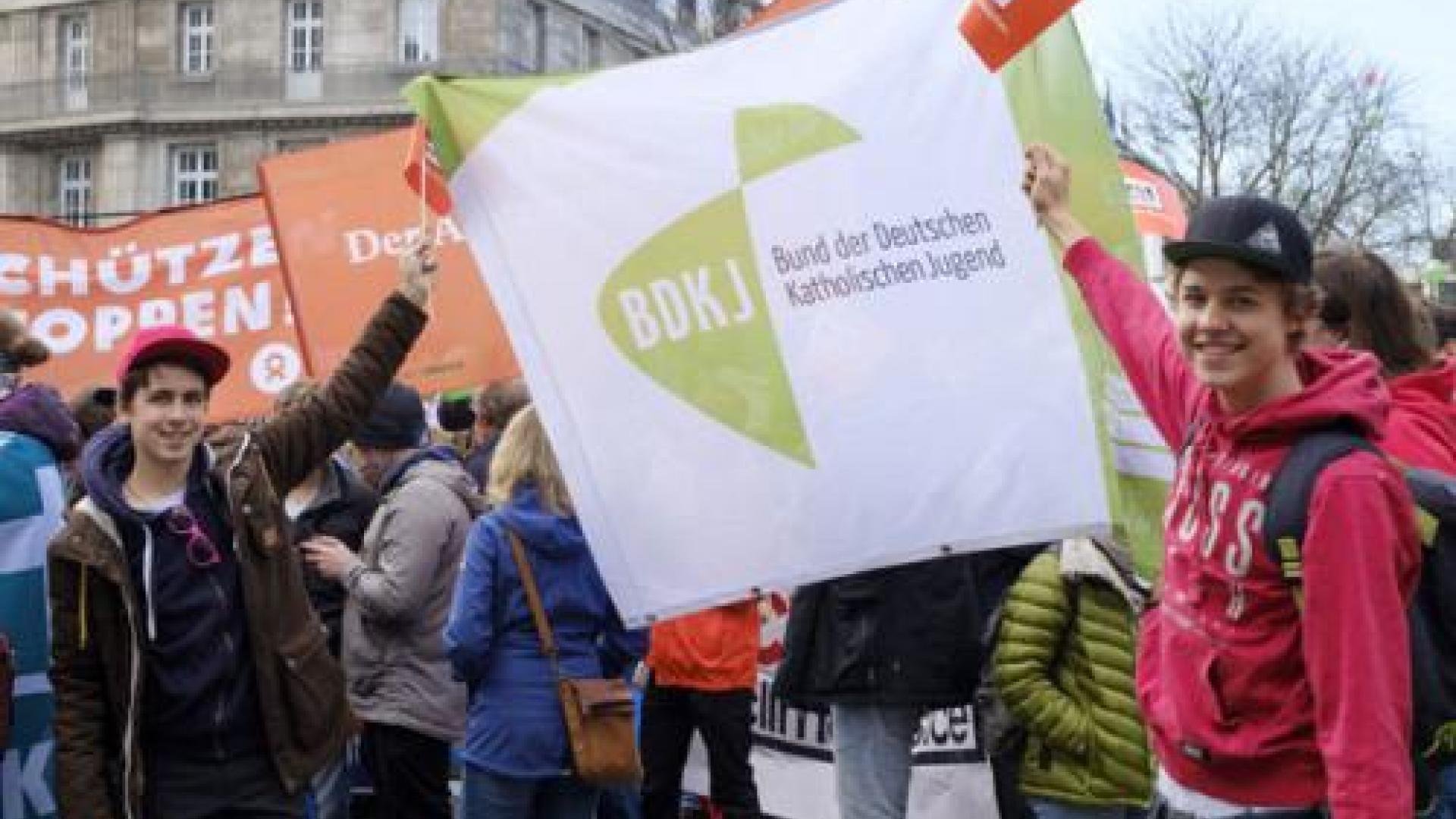 Katholisch und politisch aktiv: Jugendliche mit einer Fahne des BDKJ bei einer Demonstration für mehr Umwelt- und Klimaschutz vor der Weltklimakonferenz 2017 in Bonn. Foto: kna/Rudolf Wichert