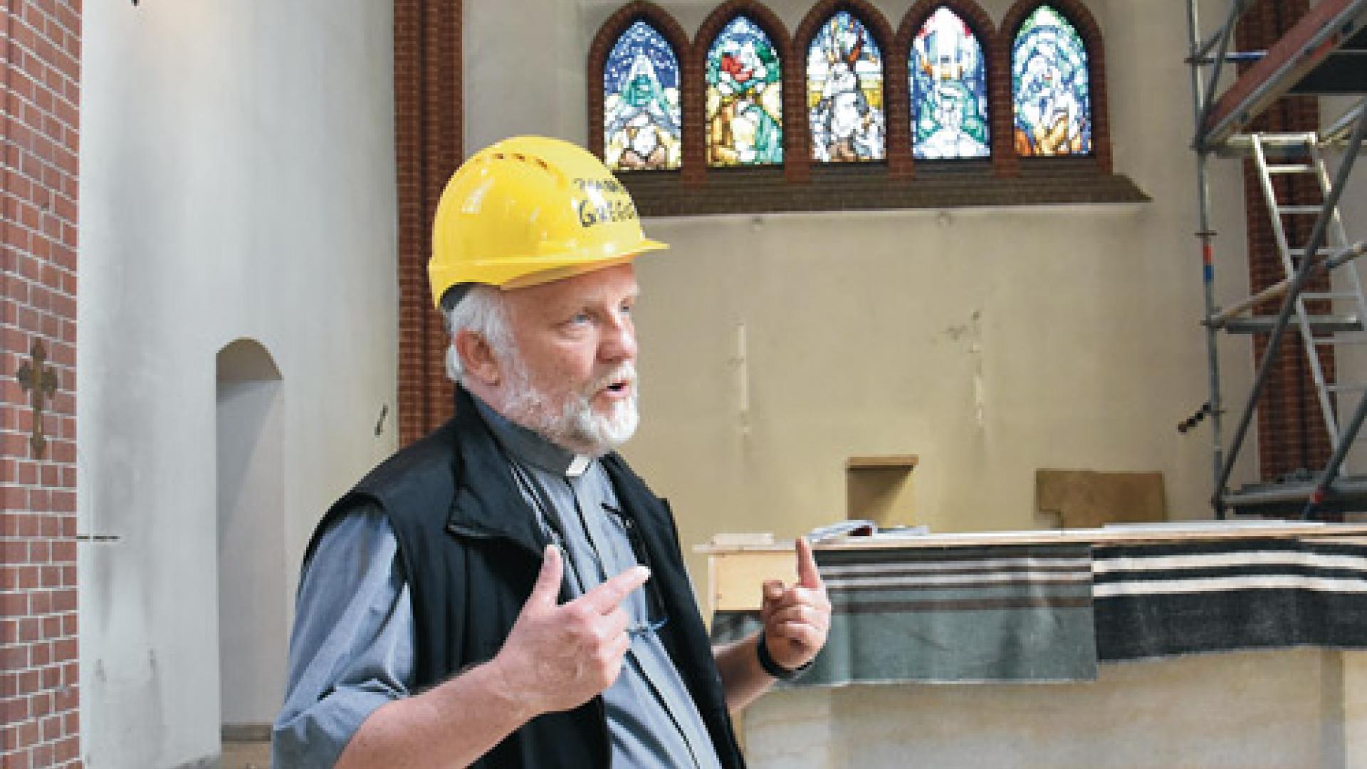 | Pfarrer Peter Paul Gregor vor der Apsis der Pfarrkirche in Hoyerswerda. Fotos: Raphael Schmidt |