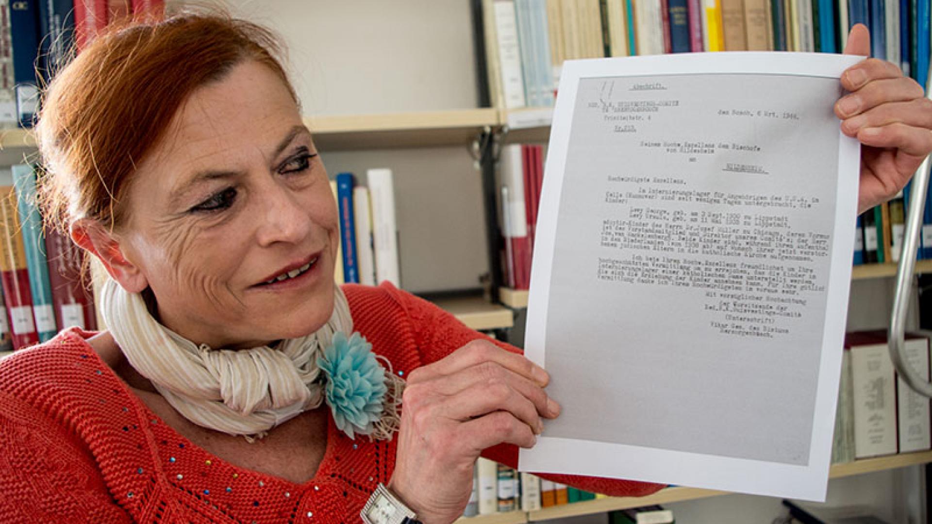 Gabriele Vogt vom Hildesheimer Bistumsarchiv zeigt ein Blatt Papier. Es ist die Abschrift einer Bitte aus dem Jahr 1944 an den damaligen Hildesheimer Bischof Joseph Godehard Machens. Der Generalvikar der niederländischen Diözese ’s-Hertogenbosch bittet den deutschen Bischof um Unterstützung zweier jüdischstämmiger, aber katholisch getaufter Kinder. Die Kinder befänden sich in einem Internierungslager in Celle.