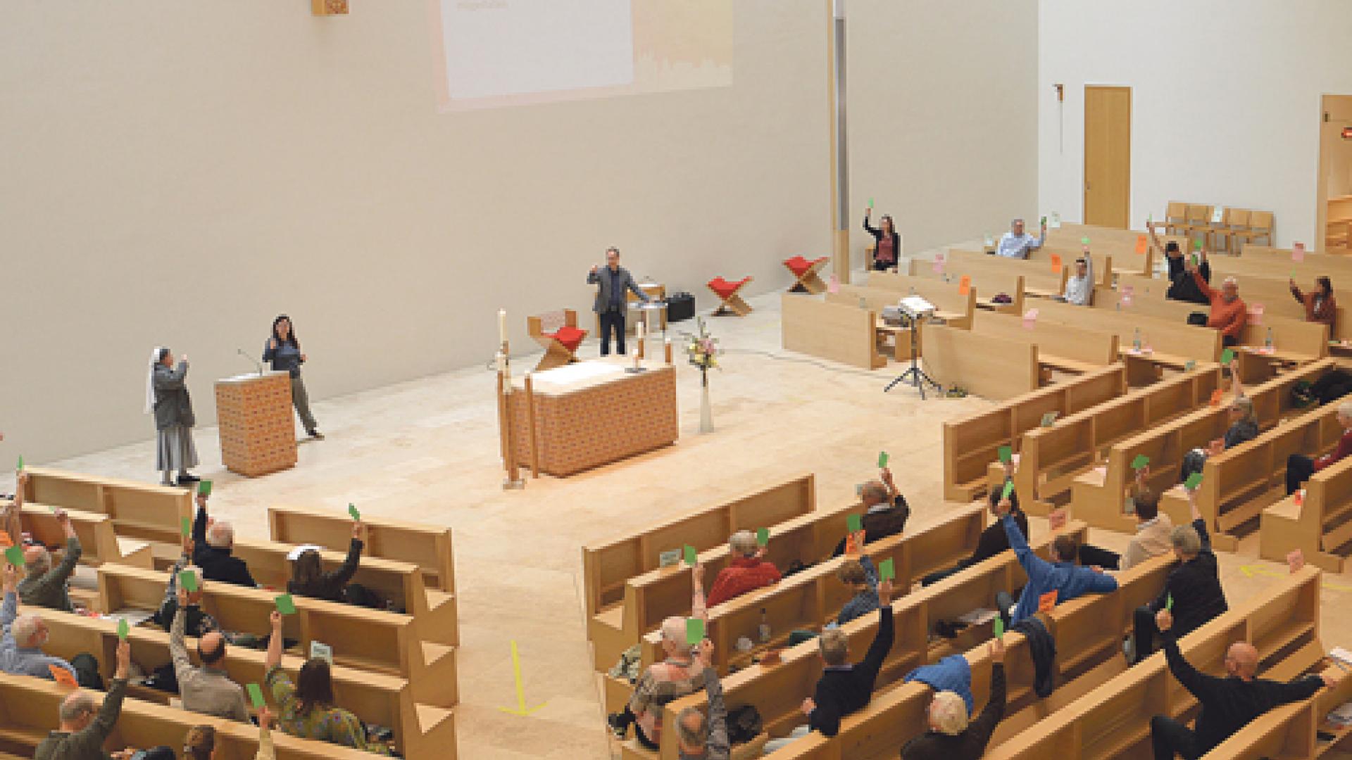 Die Delegierten stimmen über die Texte der einzelnen Arbeitsgruppen der Stadtsynode ab. Fotos: Vinzent Antal |
