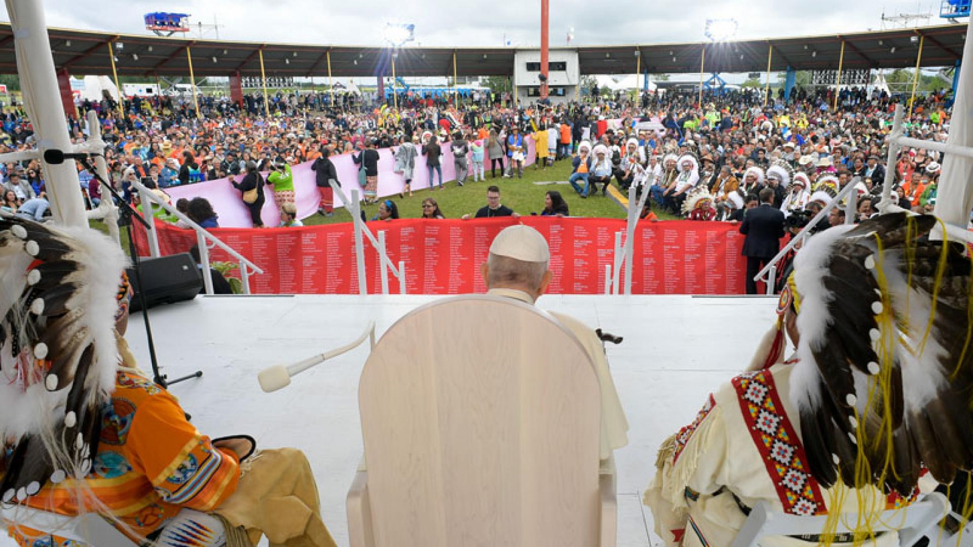 In der Arena herrscht gespannte Ruhe, als Franziskus das Unrecht benennt. Einen Schmerzensschrei rufe der Ort bei ihm hervor. "Ich denke an die Tragödie, die so viele von euch, eure Familien, eure Gemeinschaften erlitten haben; an das, was ihr mir über das Leid, das ihr in den Internatsschulen ertragen musstet, erzählt habt", so der Papst.