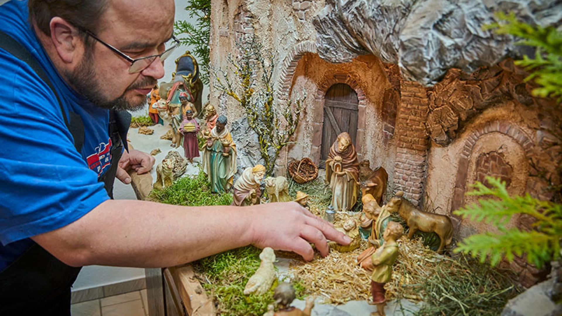 Aus Kartons holt der gelernte Tischler, der in einer Sargtischlerei arbeitet, dann Hunderte von Gipsfiguren heraus, die er über Jahrzehnte gesammelt hat. Manche messen nur zehn Zentimeter, andere sind bis zu einem Meter groß. Dutzende Marias, Josefs, Christkinder, Esel, Ochsen, Engel, Hirten und Könige sortiert er auf Tischen, Regalen und Fenstersimsen zu Weihnachtskrippen. Als Herbergen und Krippenlandschaften dienen Felsenhöhlen, moosbedeckte Innenhöfe, steinerne Häuser und Holzhütten – alles selbst gebaut und modelliert.
