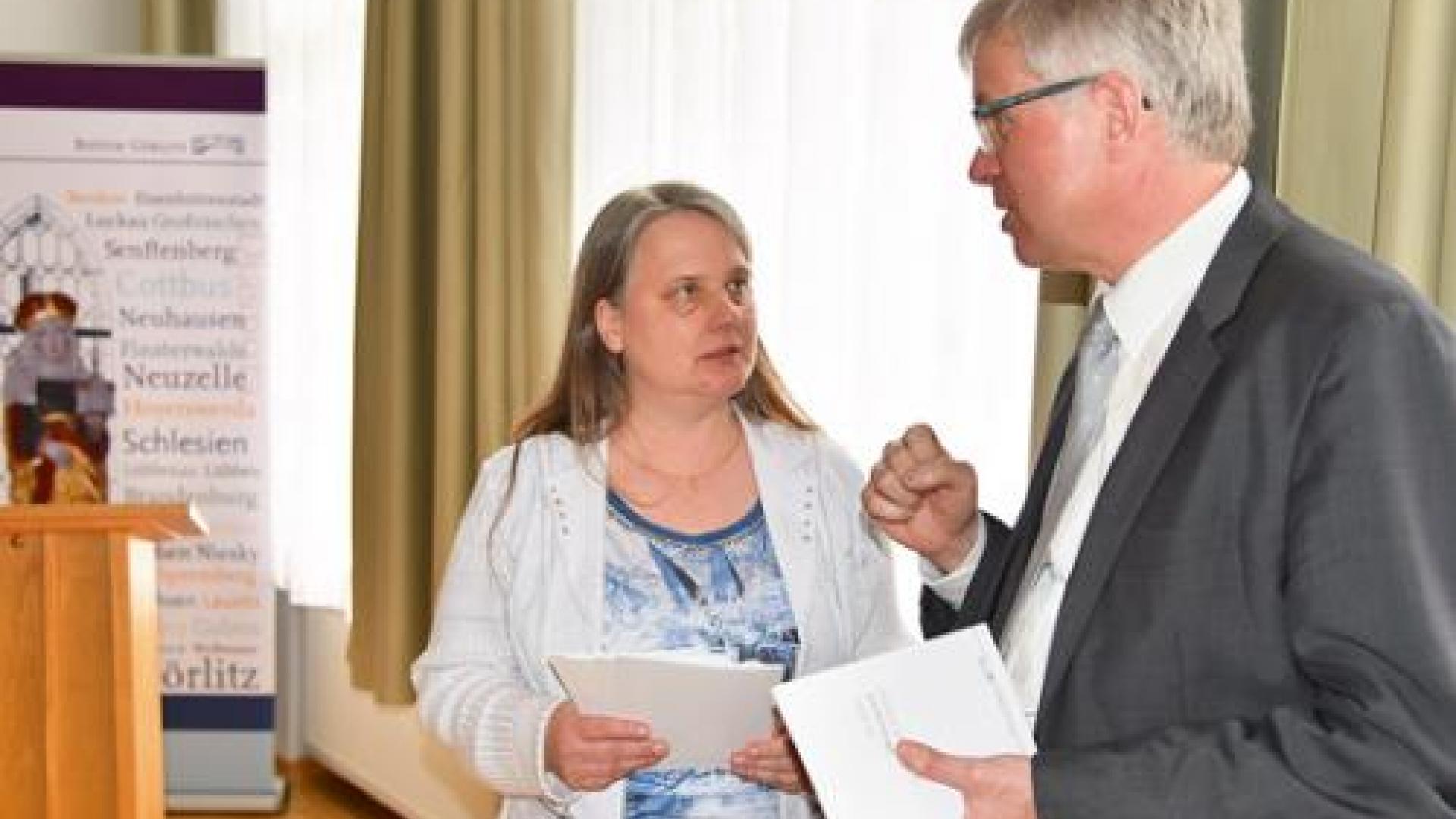 | Mit Festschriften in den Händen: Ute Mittermaier und Caritasdirektor Matthias Mitzscherlich im Gespräch. |