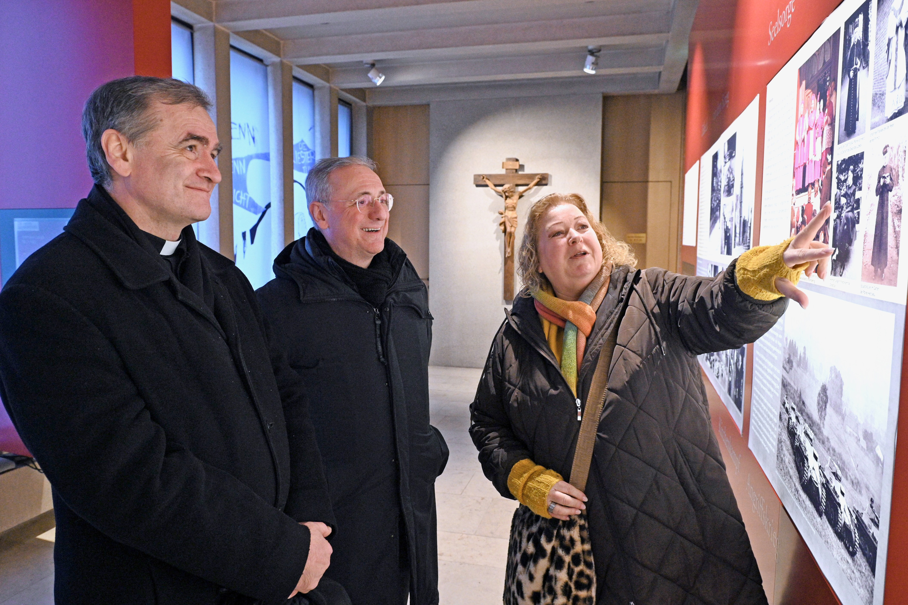 Gedenkstättenleiter Jochen Proske (li.) zeigt jungen Erwachsenen der benachbarten Hanse-Schule die Ausstellung über die Lübecker Märtyrer.