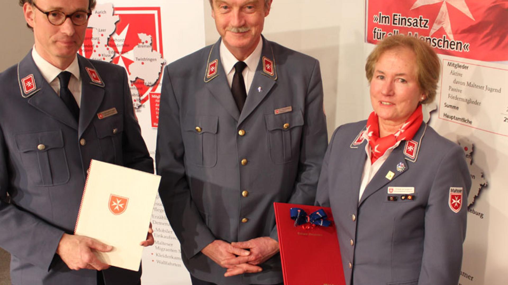 Als Dank und Anerkennung für ein über 35-jähriges, ehrenamtliches Engagement erhielt Octavie van Lengerich die Malteser-Verdienstplakette in Gold aus den Händen des Präsidenten sowie von Diözesanseelsorger Diakon Harald Niermann. Präsident von Brandenstein-Zeppelin ernannte dann den Nachfolger. Nach Prüfung mehrerer Vorschläge war die Wahl auf Johann Rotger van Lengerich gefallen. „Mit der heutigen Ernennung zum neuen Diözesanleiter freuen wir uns, jemanden gefunden zu haben, der bereits in seiner Funktion als Finanzkurator bei den Maltesern, das Bewusstsein für eine große Verantwortung unter Beweis gestellt hat“, so die Berufungsworte des Präsidenten.