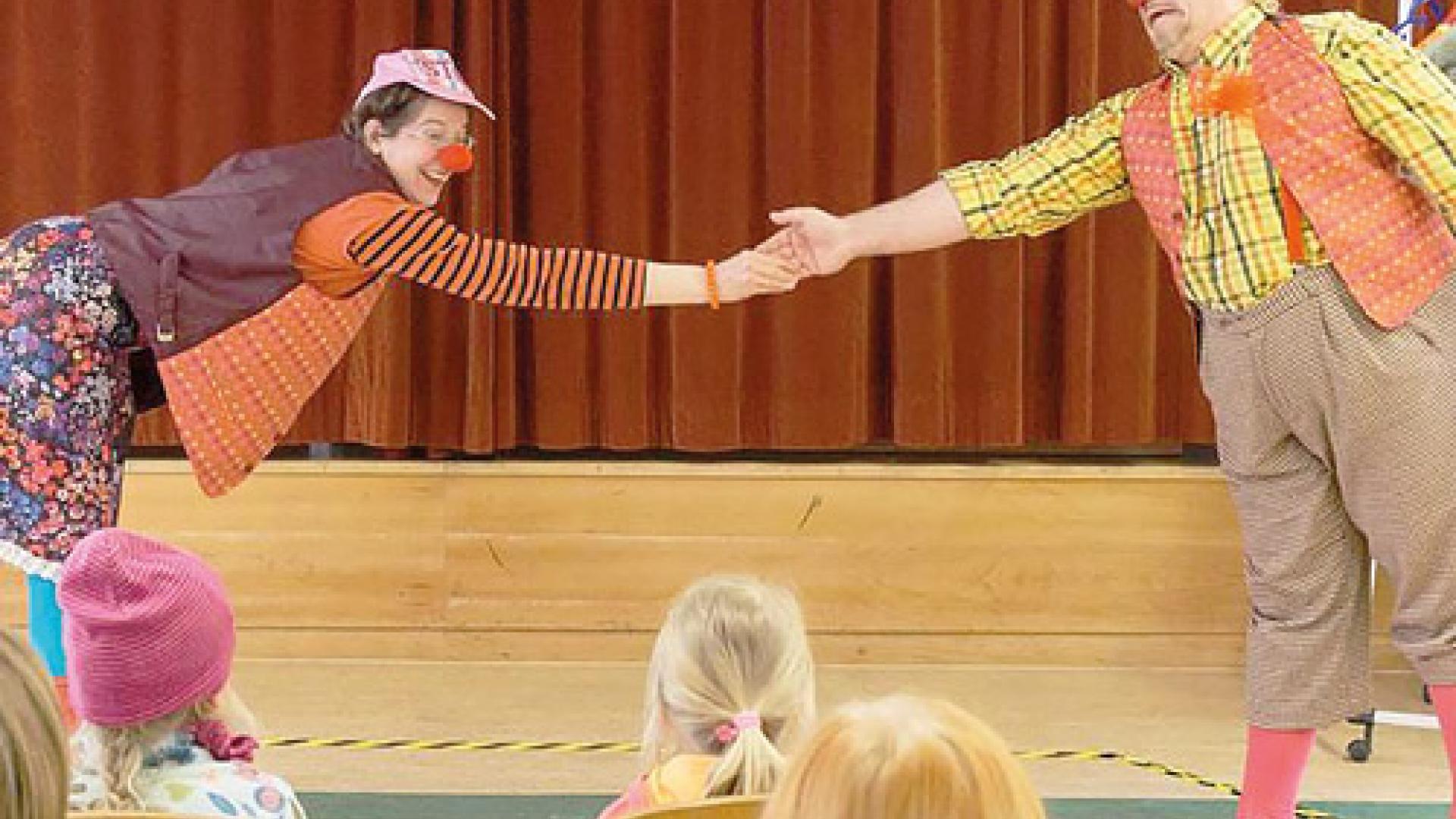 | Wieviel Nähe ist stimmig, wenn man einen Erwachsenen begrüßt? Bei der Clown-Darbietung des Starkmachtages zur Missbrauchs-Prävention üben Kinder, auf ihr eigenes Gefühl zu achten. | Fotos: Starkmachtag-Flyer |