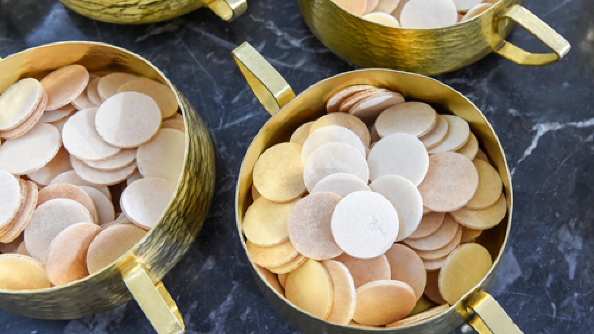 Kelche voller Hostien stehen auf einem Tisch.