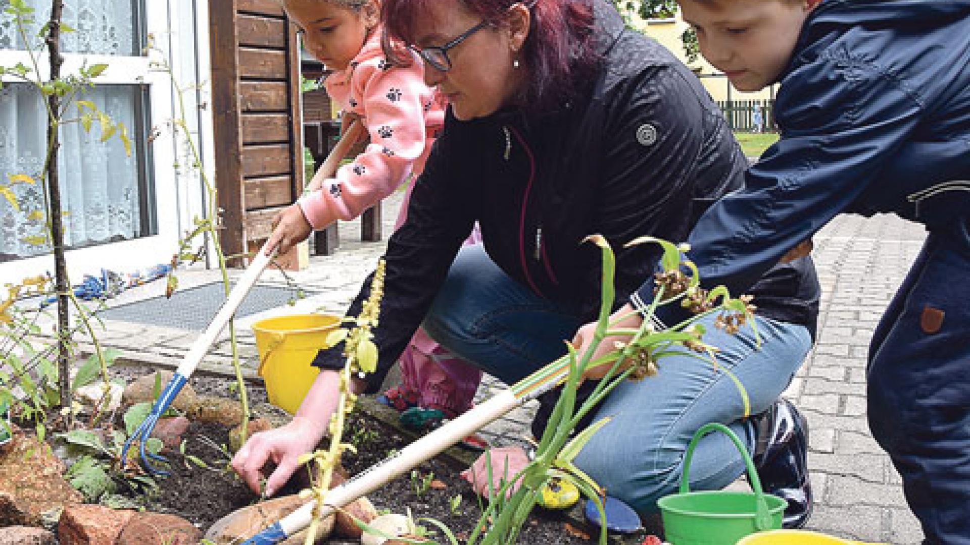 | Im Kinderhaus St. Elisabeth Hoyerswerda werden die Kinder an die heimische Natur herangeführt: Leyla, Anke Schulz und Karlo arbeiten im Naschgarten. Foto: Katrin Demczenko |