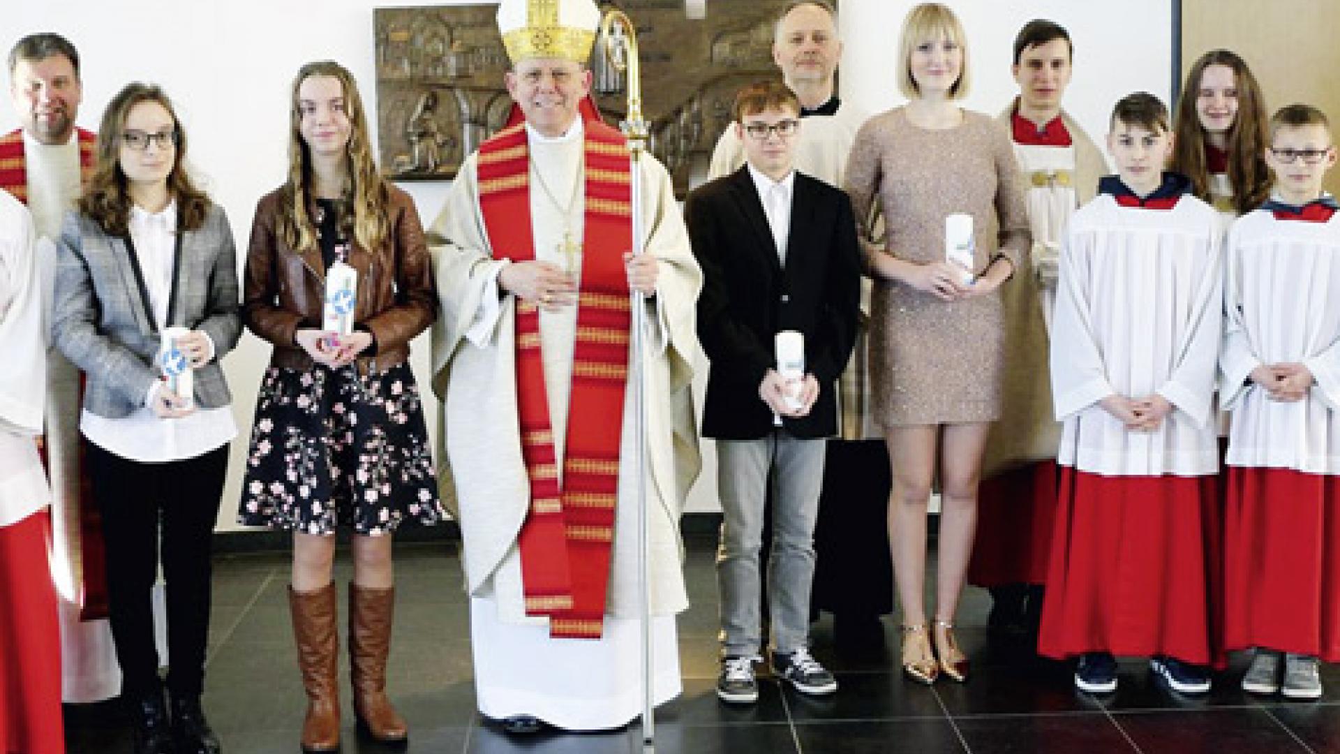 | Bischof Ulrich Neymeyr mit den vier Firmlingen, Minstranten, Schulseelsorger Markus Könen und Martin Hoffmeier, dem Sekretär des Bischofs. | Foto: Gymnasium S. Elisabeth |