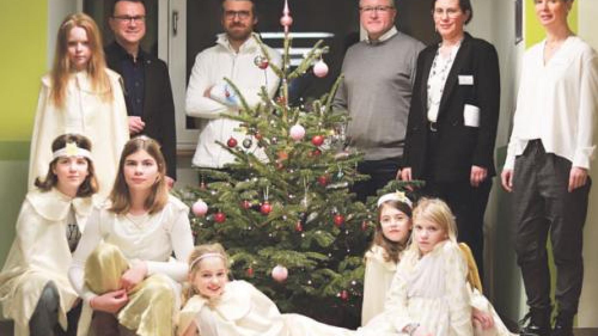 | Am Rande der jüngsten Patienten-Weihnachtsfeier des St. Carolus-Krankenhauses (von links): Diakon Bernd Schmuck, Marjan Stojanoski (Chefarzt Innere Medizin), Geschäftsführer Lutz Möller, Pflegedirektorin Katrin Raimann und Standortleiterin Daniela Kleeberg mit Kindern und Jugendlichen, die die Feier mitgestaltet haben. Foto: Stefanie Hänsch |