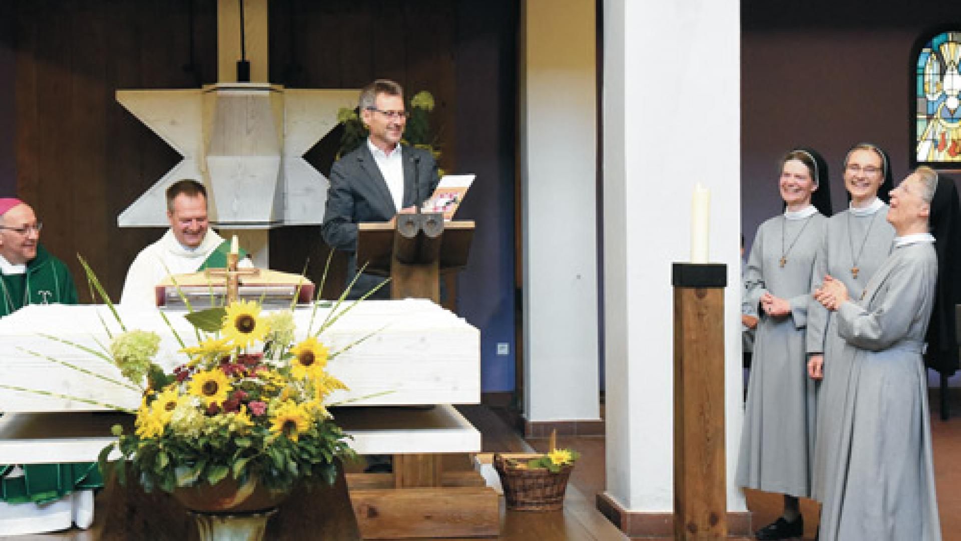 | Festgottesdienst zum Abschied der Sießener Franziskanerinnen mit Bischof Wolfgang Ipolt. Pfarrgemeinderats-Vorsitzender Hartmut Schirmer dankt den Schwestern. Fotos: Raphael Schmidt |