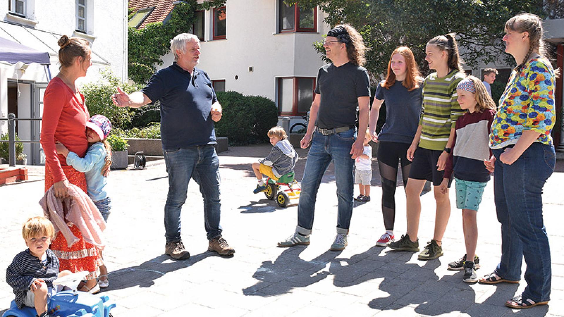 | Leiter Markus Kriesel (Bildmitte links) im Gespräch mit Teilnehmern einer 14-tägigen Familienfreizeit im Innenhof der Familienferienstätte St. Ursula in Brandenburg-Kirchmöser. Foto: Eckhard Pohl |