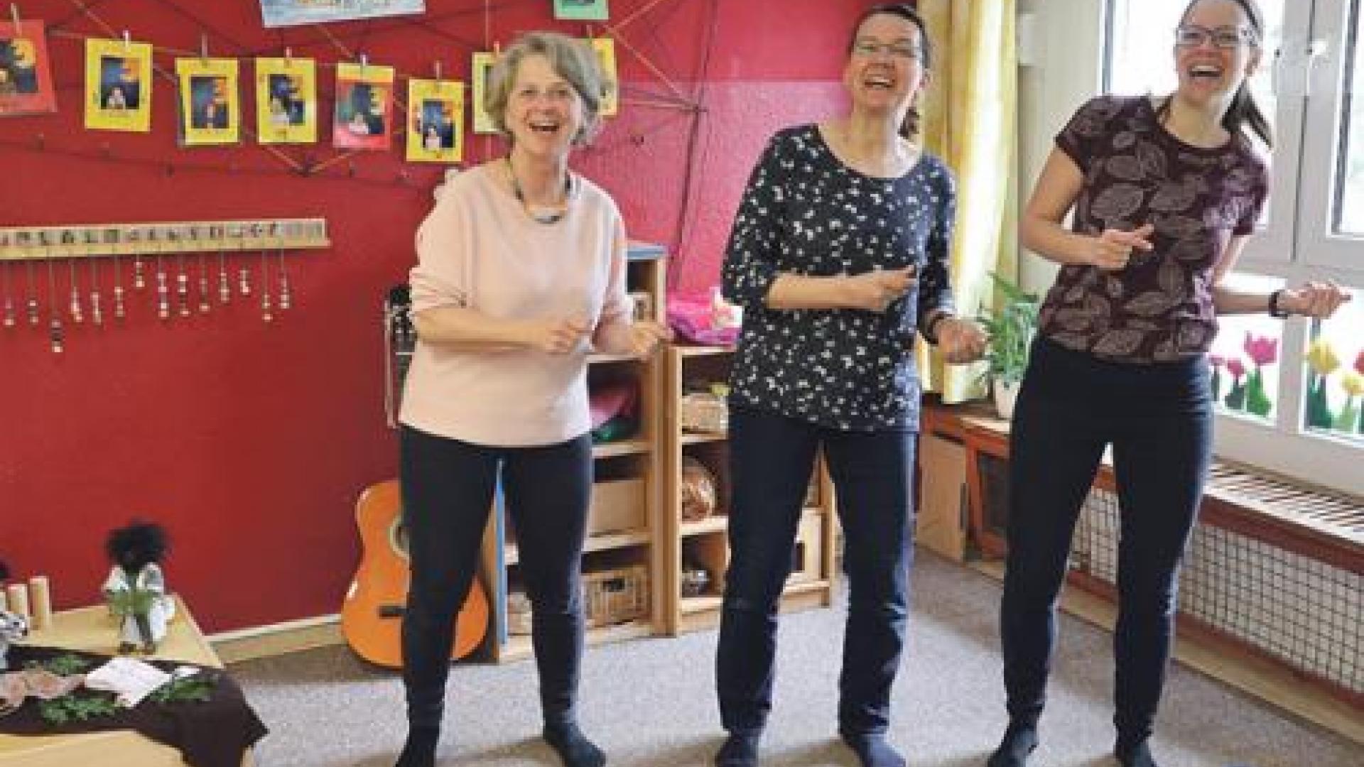 | Morgenkreis im Videostream: Drei Erzieherinnen zeigen den Kindern ein fröhliches Lied zum Mitsingen und -tanzen. Fotos: Kita St. Martin |