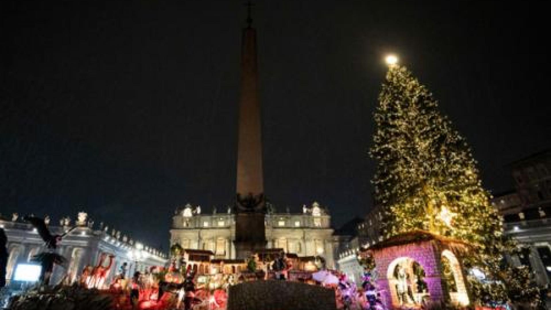 Zugleich wurde auf dem Petersplatz der Christbaum illuminiert, eine rund 28 Meter hohe Fichte aus dem italienischen Trentino. Beides ist bis 9. Januar zu besichtigen. Erzbischof Fernando Vergez Alzaga, Präsident des Governatorats des Vatikanstaates, bekräftigte bei der Zeremonie, dass das Licht des Baumes und die Krippe eine besondere Verbindung zwischen verschiedenen Sprachen und Kulturen herstellten.