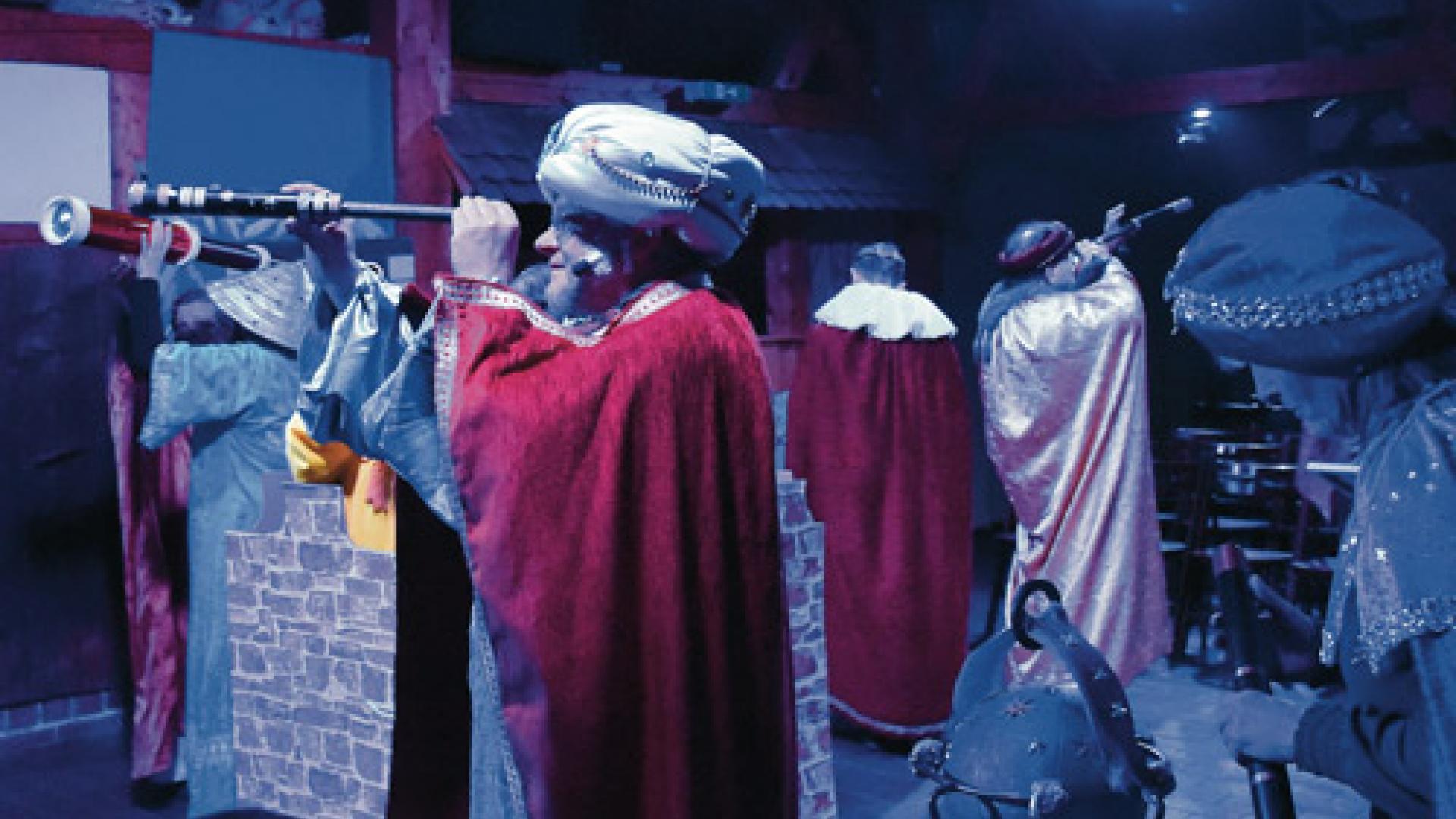 In der ersten Szene verkünden drei Propheten von der Ballustrade der Scheune aus die Ankunft des Gottessohnes. Jesaja beginnt: „Der Herr selbst wird euch ein Zeichen geben: Siehe, eine Jungfrau ist schwanger und wird einen Sohn gebären, den wird sie nennen Immanuel, das heißt übersetzt: ,Gott ist mit uns‘. Hofft und glaubt!“ Sterndeuter haben ein anderes Zeichen am Himmel ausgemacht: eine besondere und seltene Sternen-Konstellation. Und sie wollen erkunden, was es damit auf sich hat. Als ihre Kinder das mitbekommen, wollen sie mitkommen. Und sie setzen sich damit durch.