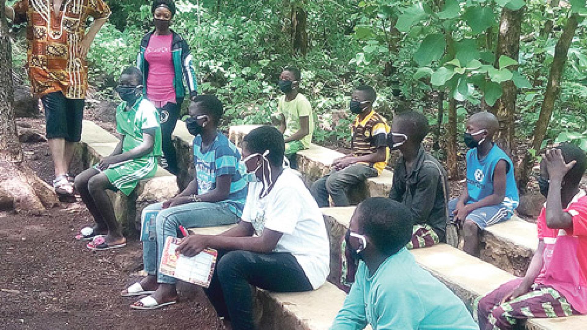 | In Togo können die Kinder wegen Corona nicht zur Schule gehen. Auf dem Pfarrgelände in Solla (im Hintergrund rechts neben dem Baum Pfarrer Ronald Kudla) wird deshalb Nachhilfeunterricht angeboten. Foto: privat |
