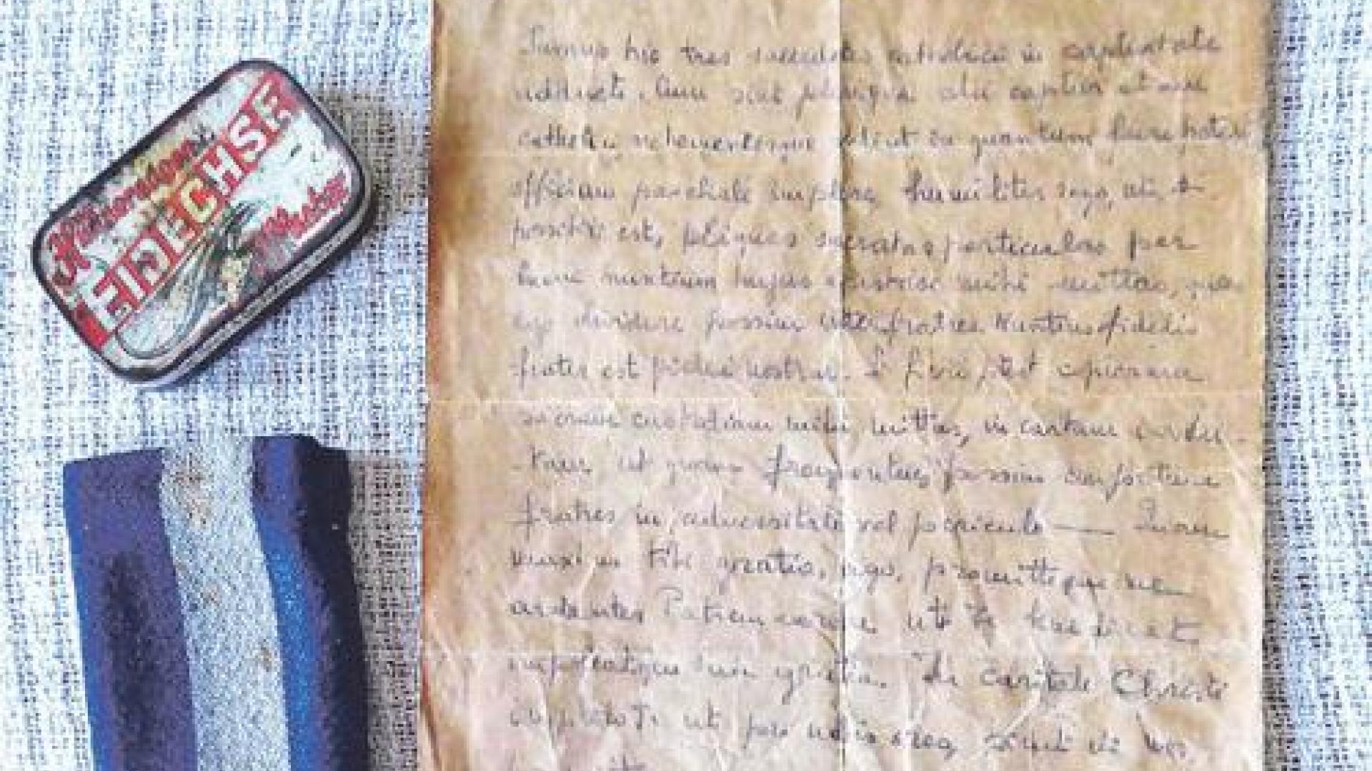 | Der Brief mit der Bitte der belgischen Priester sowie die Pflaster-Dose und ein Säckchen, in dem die Hostien versteckt waren, sind in der St.-Josefs-Kirche in Blankenburg zu sehen. Fotos: Pfarrei Blankenburg |