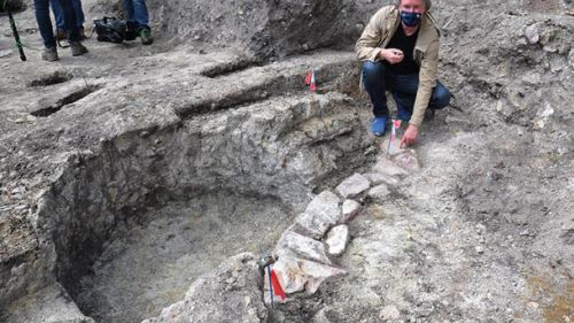 | Grabungsleiter Dirk Plaschta am Ende der Fundamentreste der südlichen Seitenapsis. Außen an der Mauer befand sich ein Grab. |
