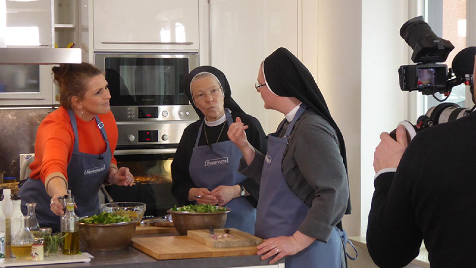 „Zuhause – Vorspeise die Erste“, sagt Bettina Gehrke, Aufnahmeleiterin der Sendung. Start der Dreharbeiten am fünften Drehtag. Heute wird in der Konventküche im Mutterhaus der Barmherzigen Schwestern gedreht. Die Küche ist aufwendig beleuchtet, gefilmt wird mit drei Kameras. Moderatorin und Pastorin Annette Behnken sitzt gemeinsam mit Generaloberin Schwester Maria Teresa Slaby und Oberin Schwester Maria Hanna Schmaus am Küchentisch. Es wird besprochen, wer die Zwiebeln kleinschneiden soll und wer sich um die Kartoffeln kümmert.