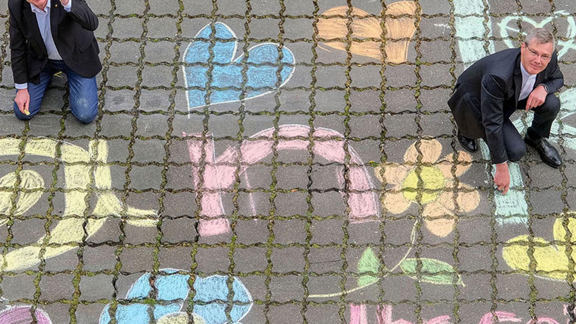 Zehn Meter zieht sich vor dem Caritas Senioren- und Pflegeheim Teresienhof ein Kreidegemälde über das Pflaster. „Danke“, „Ihr seid unersetzlich“, „Ohne Euch geht es nicht“ ist darauf zu lesen. Auch Bischof Heiner Wilmer und Caritasdirektor Achim Eng nahmen bunte Kreidestücke in die Hand, um den Pflegekräften im gesamten Bistum symbolisch zu danken. Die Aktion weist auf den Internationalen Tag der Pflegenden hin. Die Mitarbeitenden des Teresienhofes beobachteten das Entstehen des Bildes von den Fenstern aus.