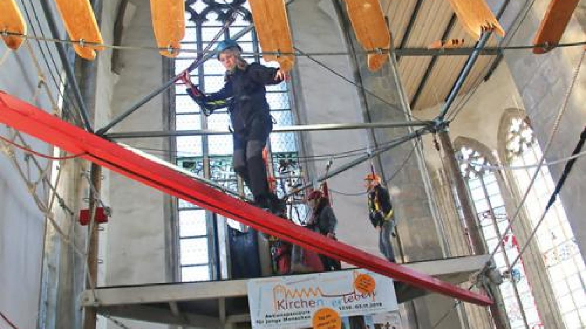 Klettern in der Kirche? Geht das überhaupt? Der Hochseilgarten „getragen wagen“ war seit 17. Oktober eine der Stationen des Aktionsparcours „Kirche(n) (er)leben“ in den Ökumenischen Höfen in Magdeburg. Verschiedene Angebote machten verschiedene Aspekte von Kirche erfahrbar.
